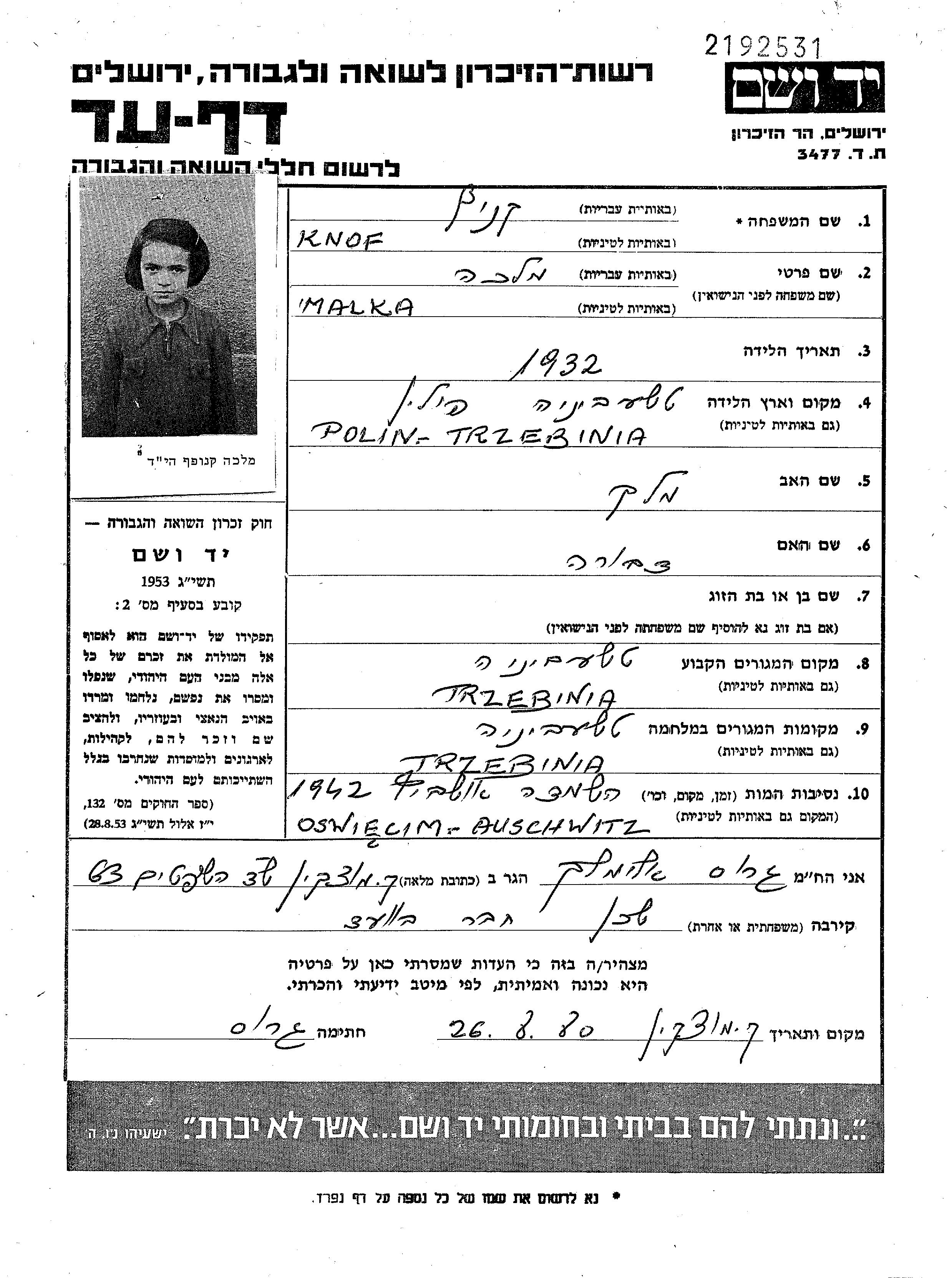 Malka Knof wurde im Jahr 1932 in Trzebinia, Polen geboren. Vor dem Zweiten Weltkrieg lebte sie in Trzebinia, Polen.
