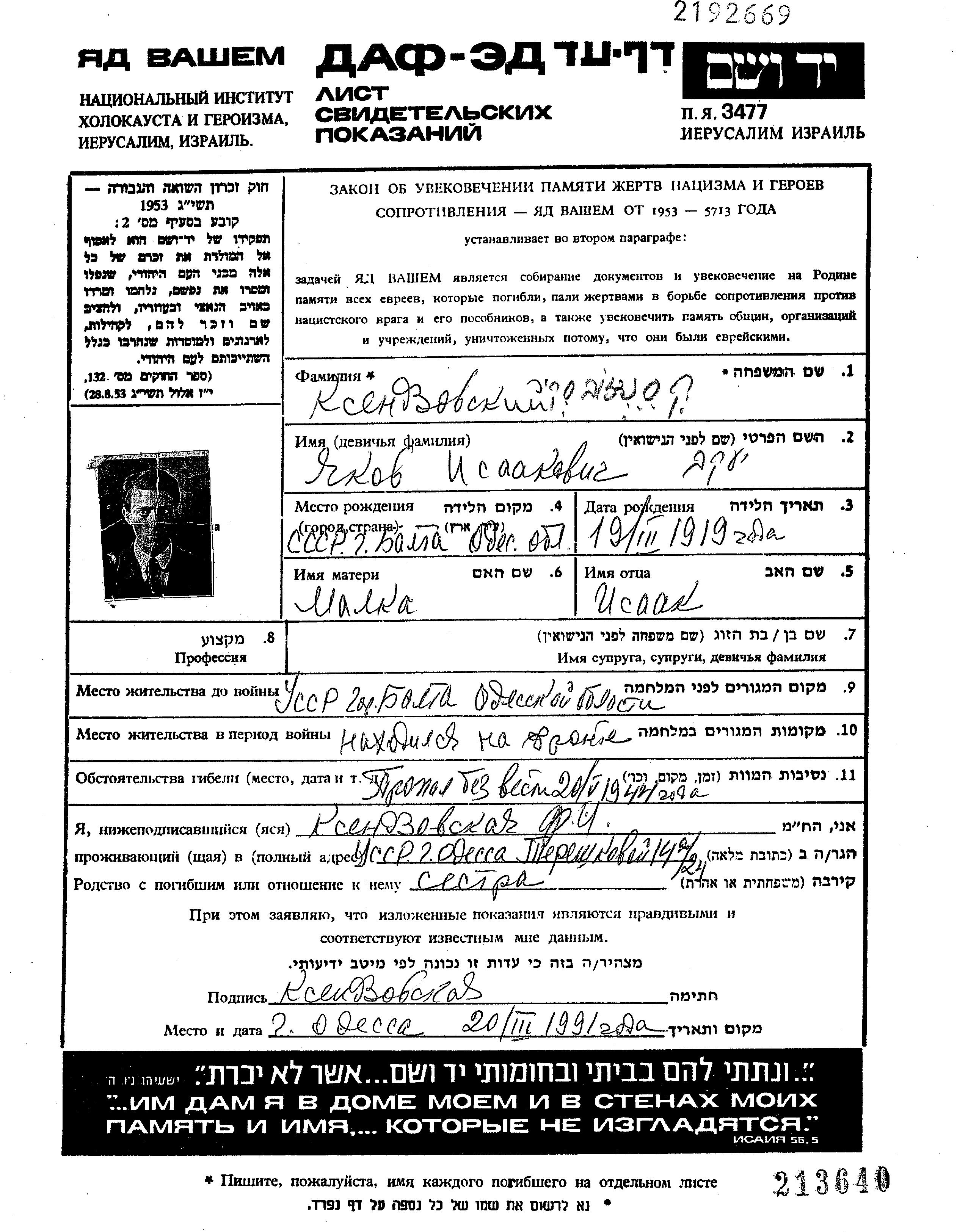 Ksendzovski Jakov 1919 Balta, Ukraine (UdSSR) Gedenkblatt