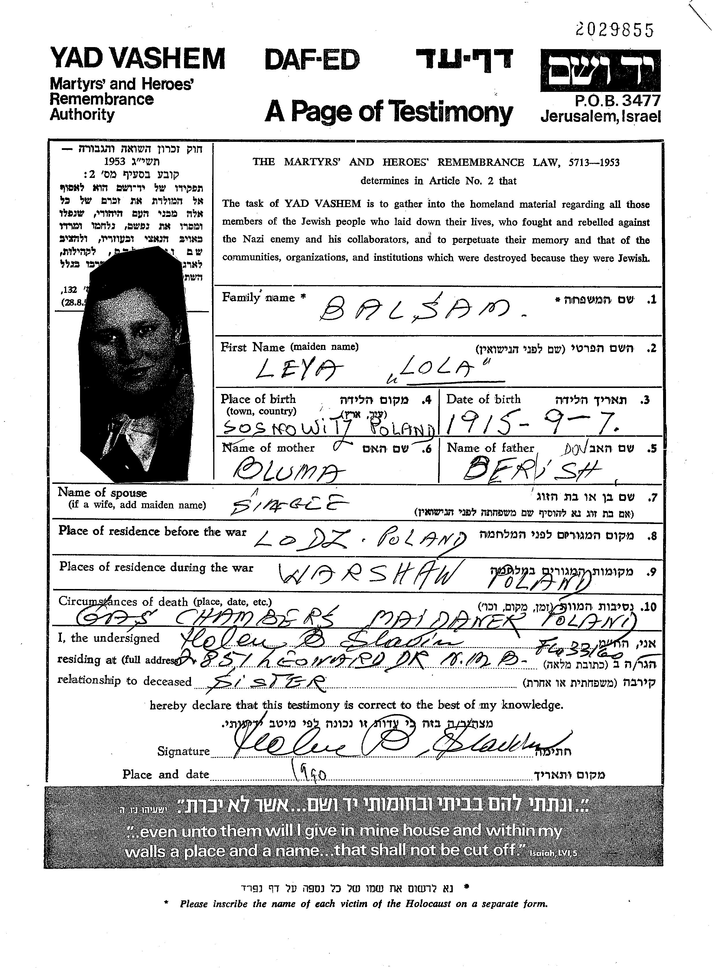 Leya Lola Balsam wurde im Jahr 1915 in Sosnowiec, Polen geboren. Vor dem Zweiten Weltkrieg lebte sie in Łódź, Polen.