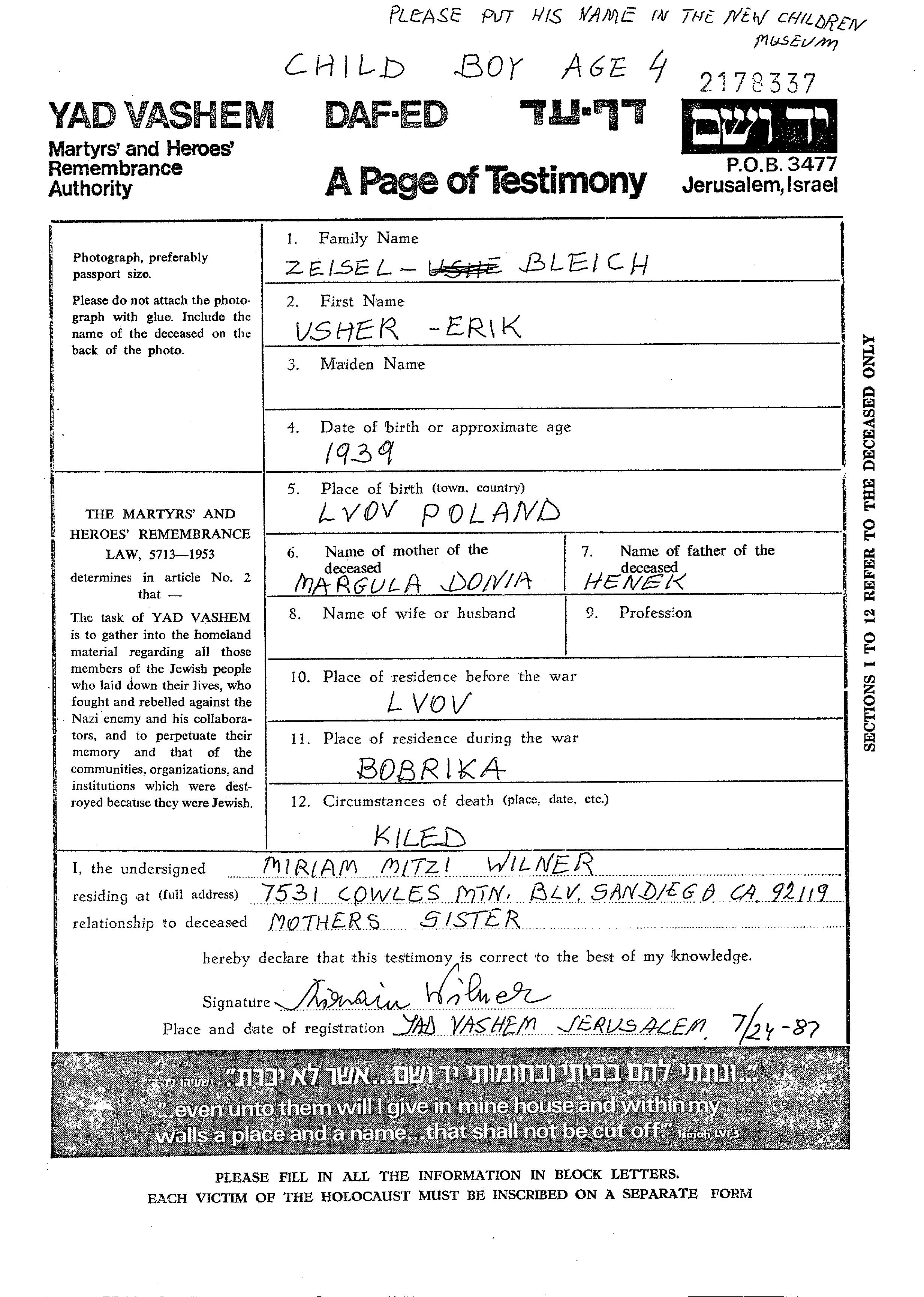 Usher Erik Zeisel Bleich wurde im Jahr 1939 in Lwow, Polen geboren. Er war der Sohn von Henek und Margula Donia, geb. Bleich. Er war Kind. Vor dem Zweiten Weltkrieg lebte er in Lwow, Polen. Während des Krieges war er in Bobrka, Polen.