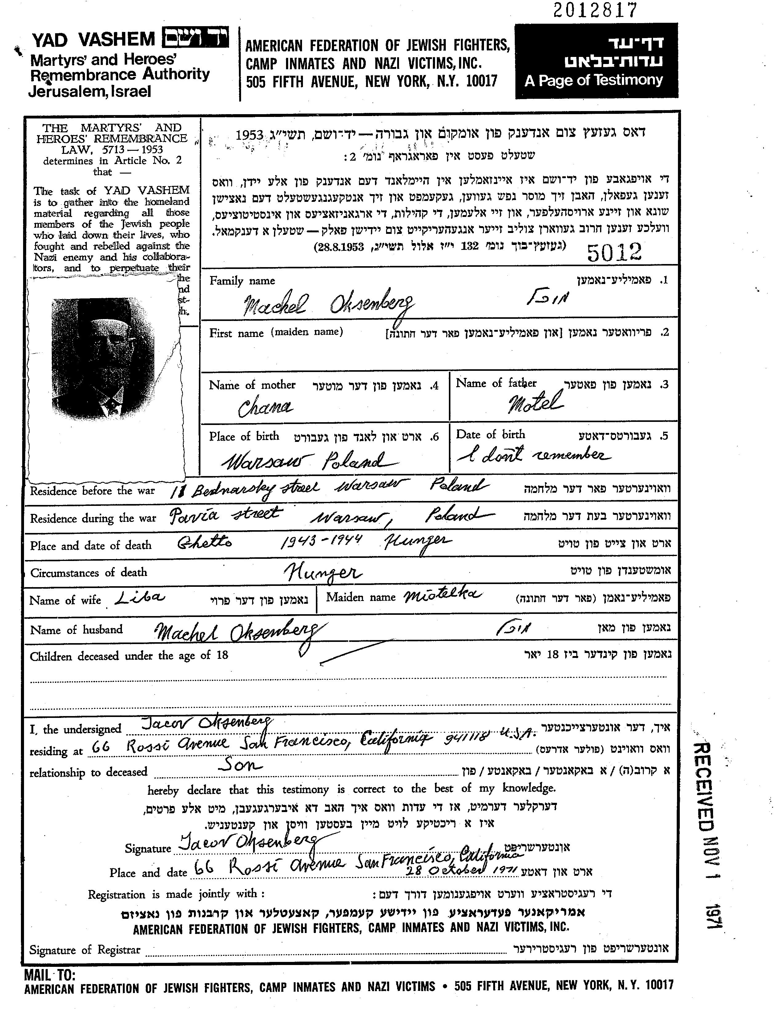 Machel Mikhal Oksenberg wurde in Warszawa, Polen geboren. Vor dem Zweiten Weltkrieg lebte er in Warszawa, Polen.
