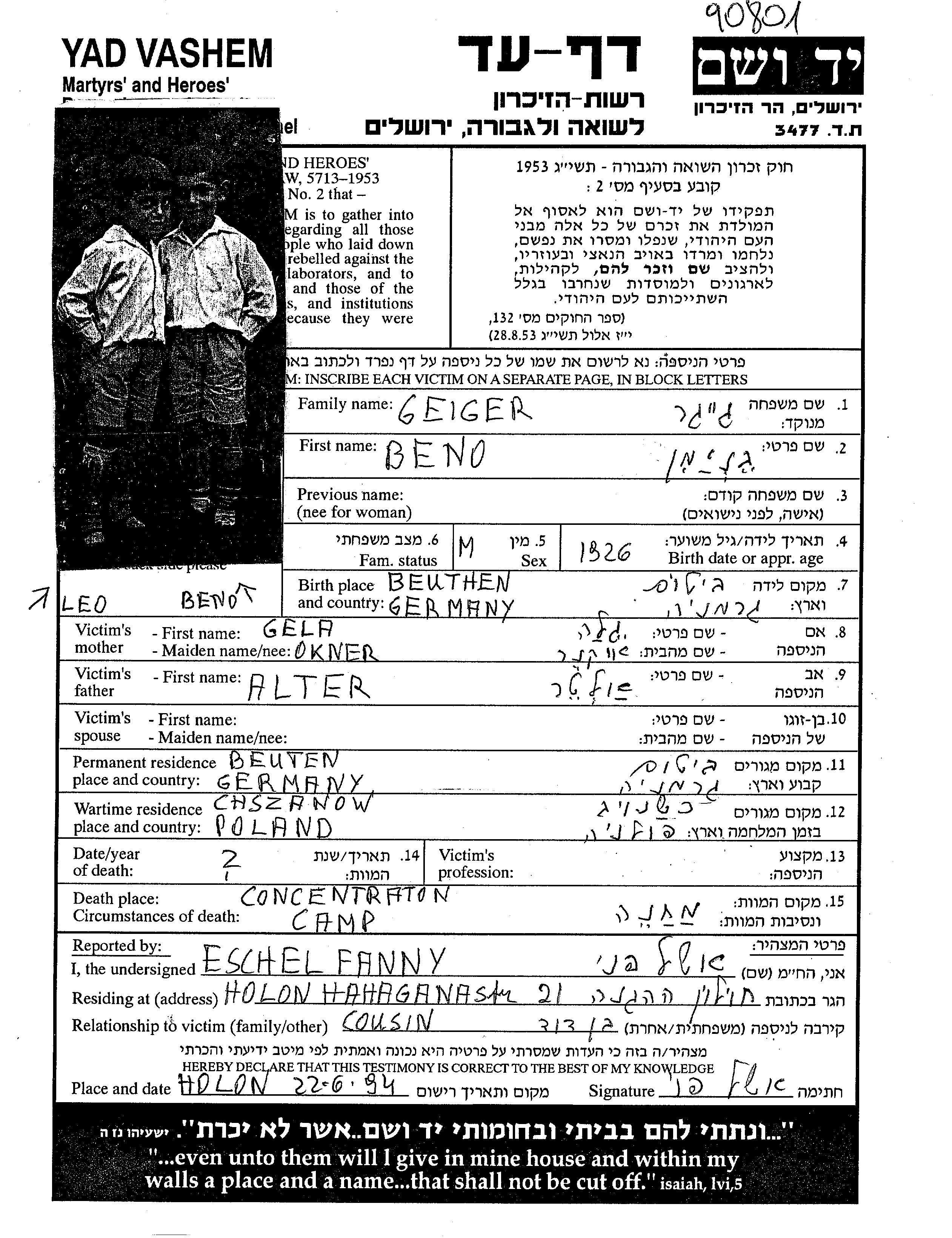Geiger | Beno Beniamin | 1926 | Beuthen, Deutsches Reich | Gedenkblatt |