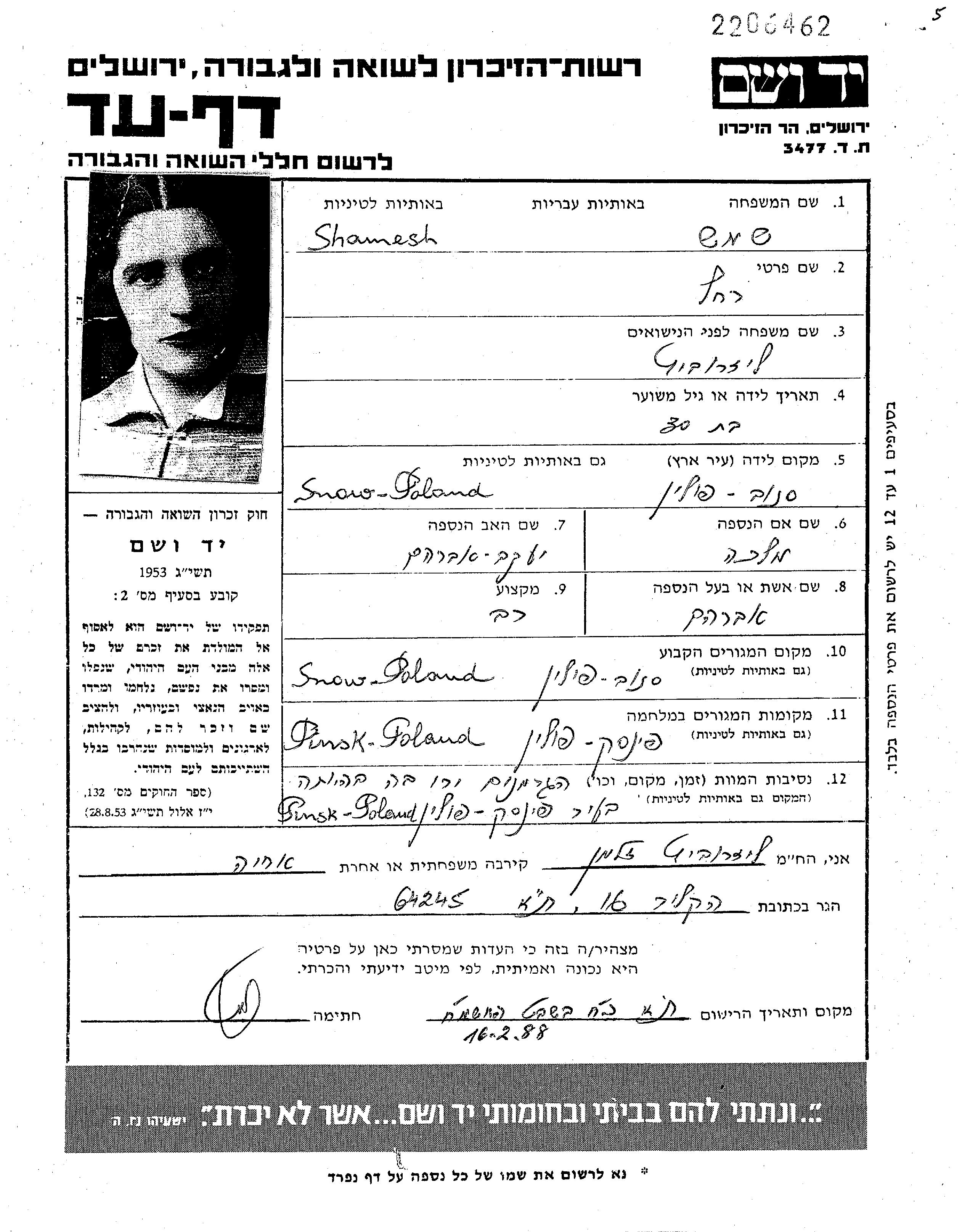 Rachel Shamesh Shemesh, geb. Leizerovitz wurde in Snow, Polen geboren. Vor dem Zweiten Weltkrieg lebte sie in Snow, Polen.
