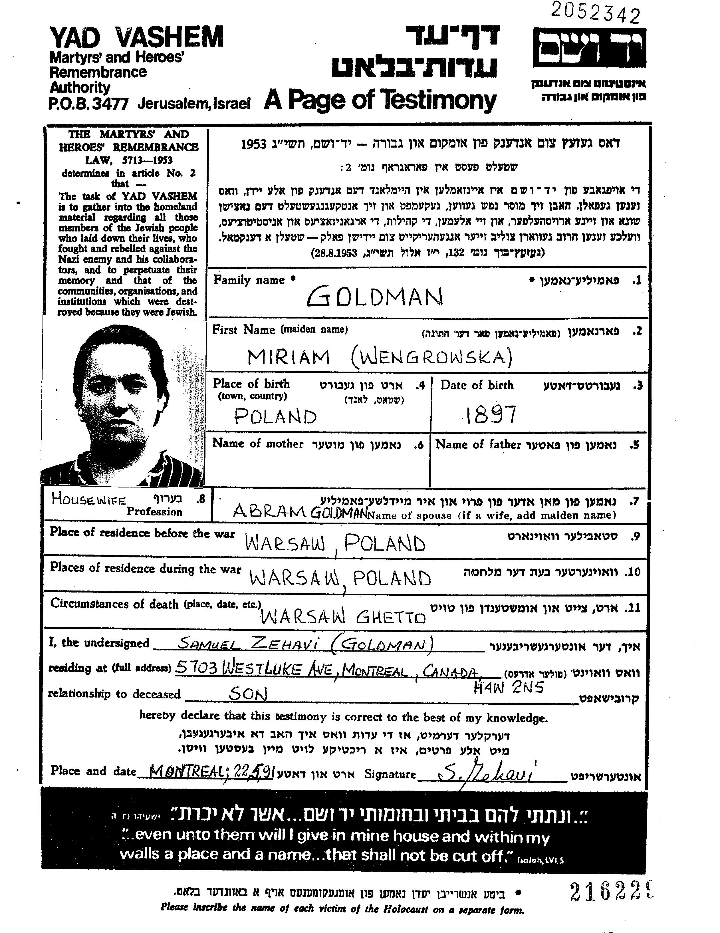 Miriam Goldman, geb. Wengrowski wurde im Jahr 1897 in Polen geboren. Sie war Hausfrau. Vor dem Zweiten Weltkrieg lebte sie in Warszawa, Polen.