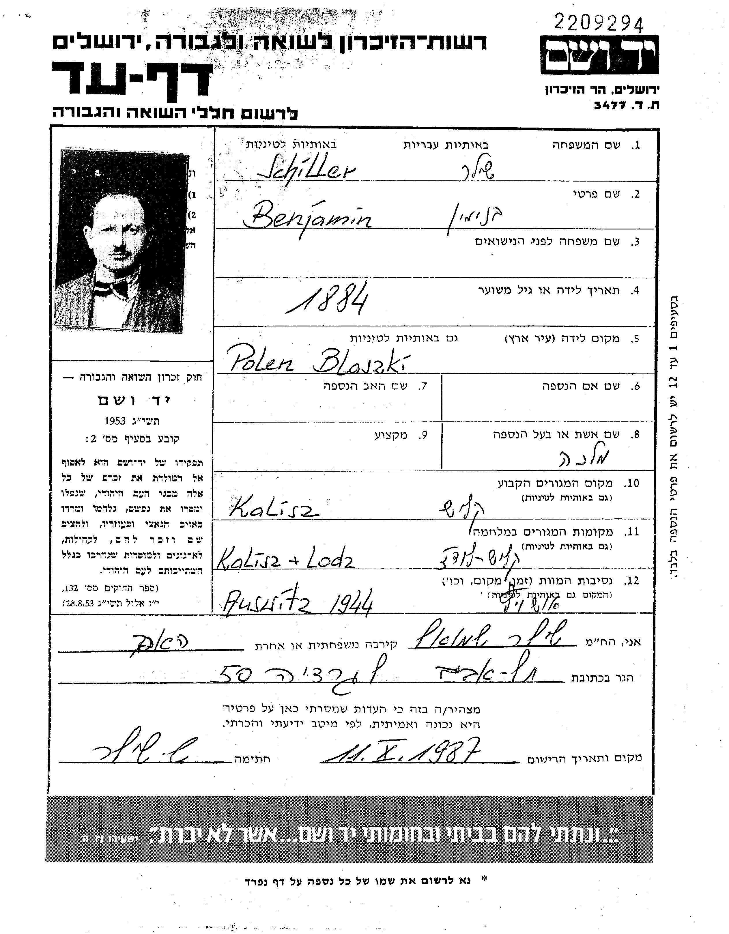 Benjamin Schiller wurde in Blaszki, Polen geboren. Vor dem Zweiten Weltkrieg lebte er in Kalisz, Polen.