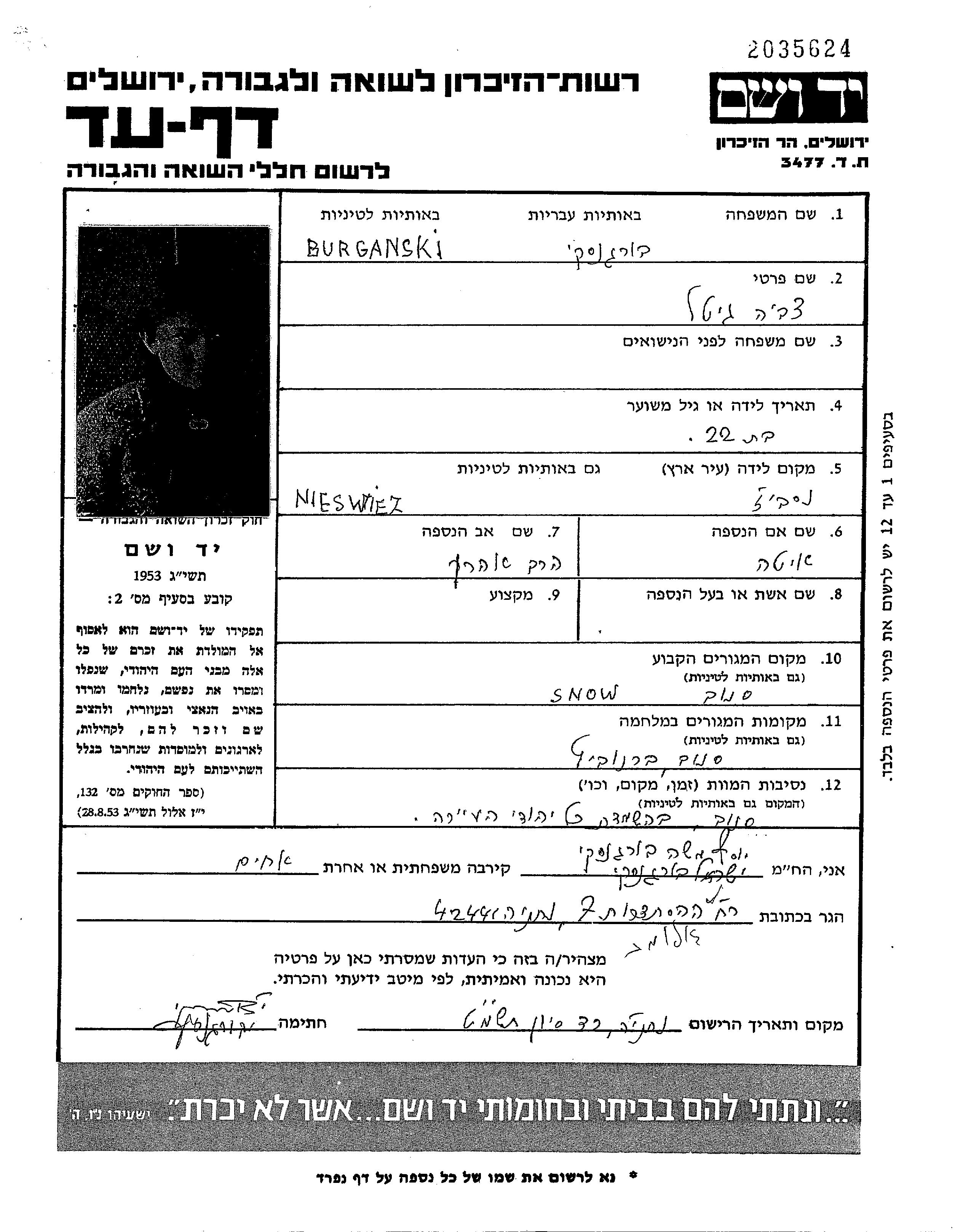 Tzvia Gitl Burganski wurde in Nieśwież, Polen geboren. Vor dem Zweiten Weltkrieg lebte sie in Snow, Polen.