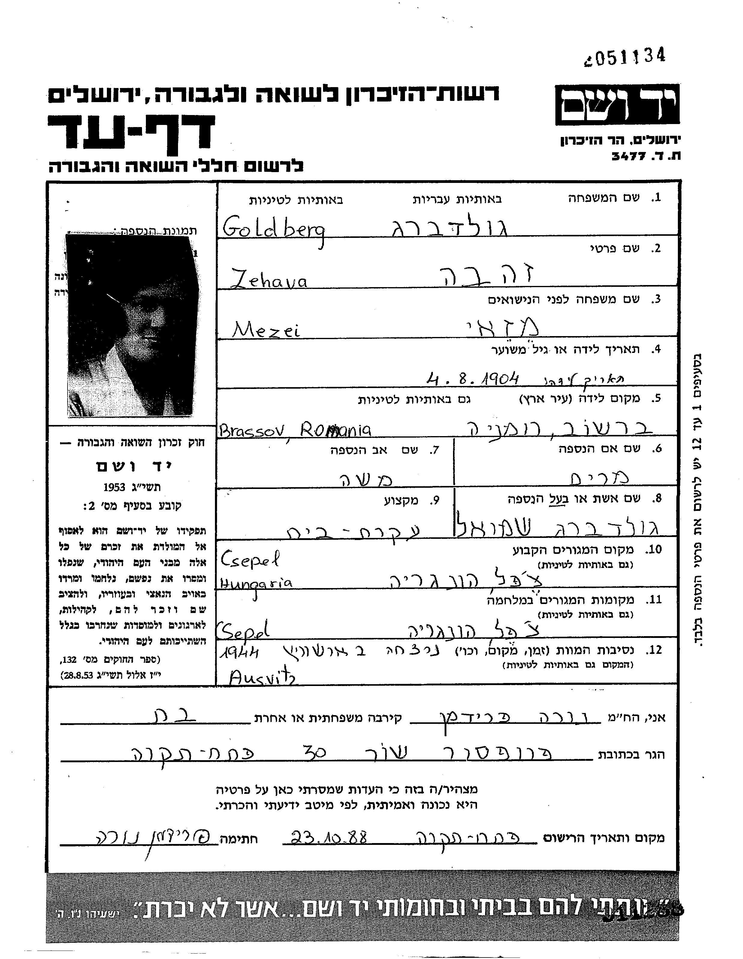Zehava Goldberg, geb. Mezei wurde im Jahr 1904 in Brasov, Rumänien geboren. Sie war Hausfrau. Vor dem Zweiten Weltkrieg lebte sie in Csepel, Ungarn.