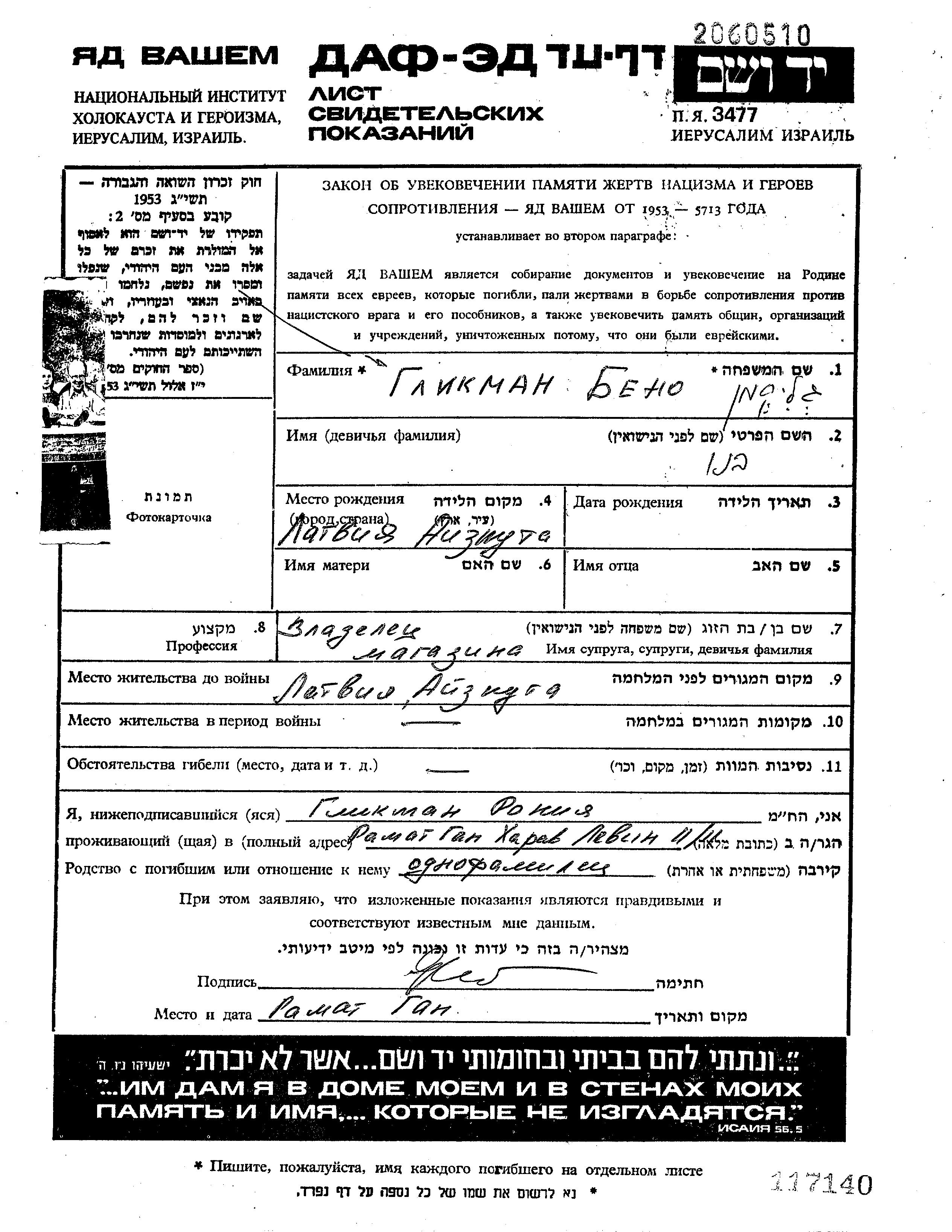 Glikman Beno Aizpute, Lettland Gedenkblatt