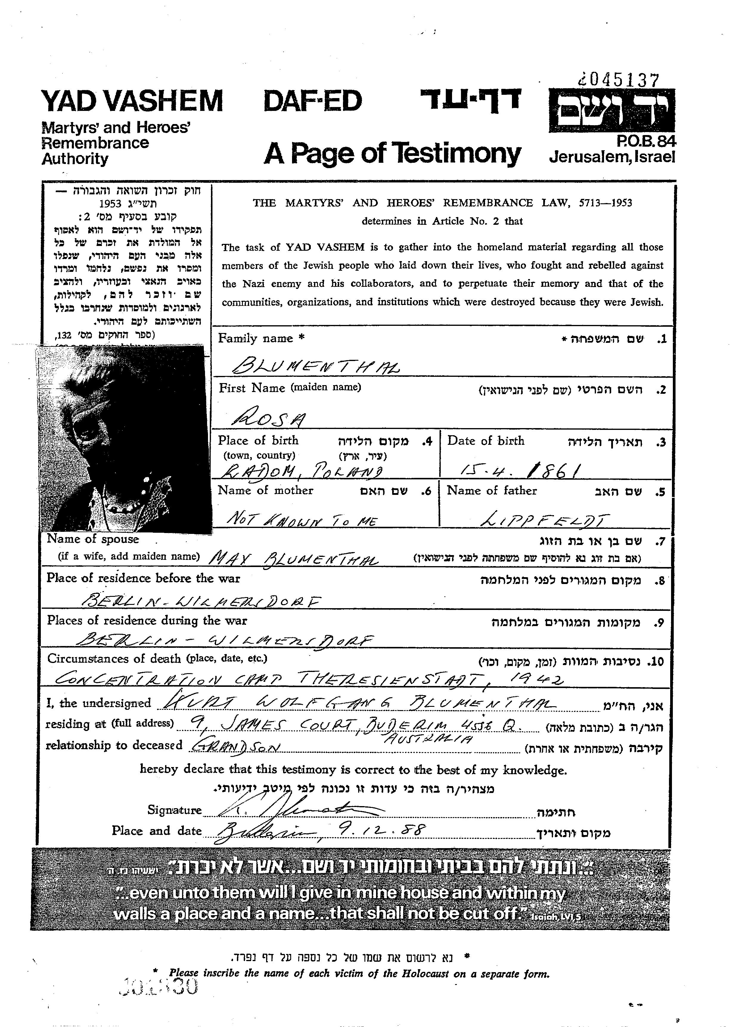 Rosa Blumenthal, geb. Lippfeldt wurde im Jahr 1861 in Radom, Polen geboren. Vor dem Zweiten Weltkrieg lebte sie in Berlin Wilmersdorf, Deutsches Reich.