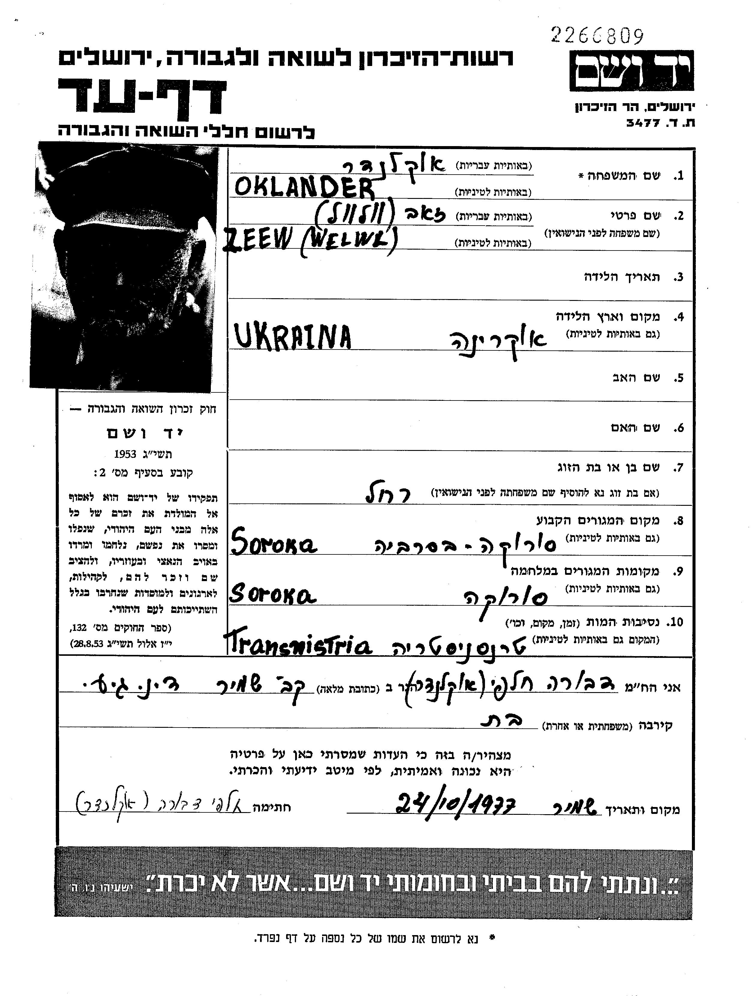 Zeew Welwl Oklander wurde in Ukraine (UdSSR) geboren. Vor dem Zweiten Weltkrieg lebte er in Soroca, Rumänien.