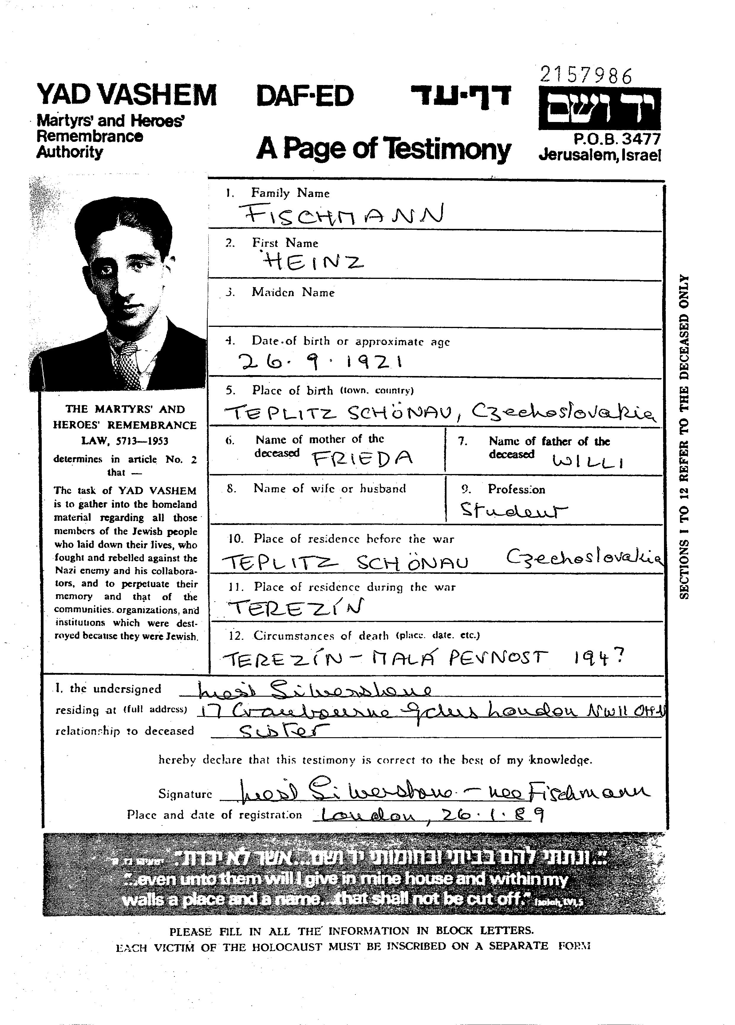 Heinz Fischmann wurde im Jahr 1921 in Teplice Sanov, Tschechoslowakei geboren. Er war Student. Vor dem Zweiten Weltkrieg lebte er in Teplice Sanov, Tschechoslowakei.