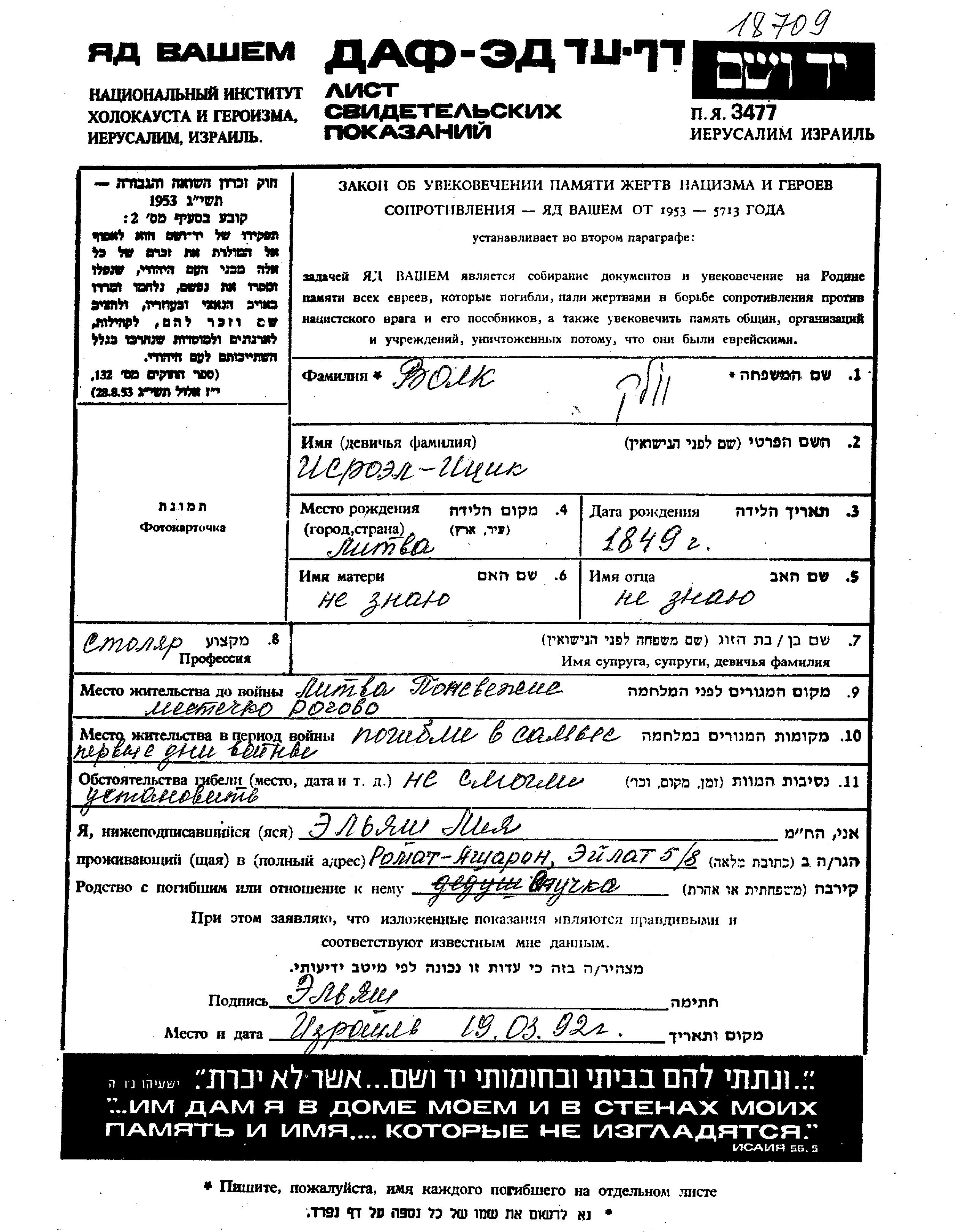 Isroel Itzik wurde in der Schoah ermordet. Todesort: unbekannt im Jahr 1941.