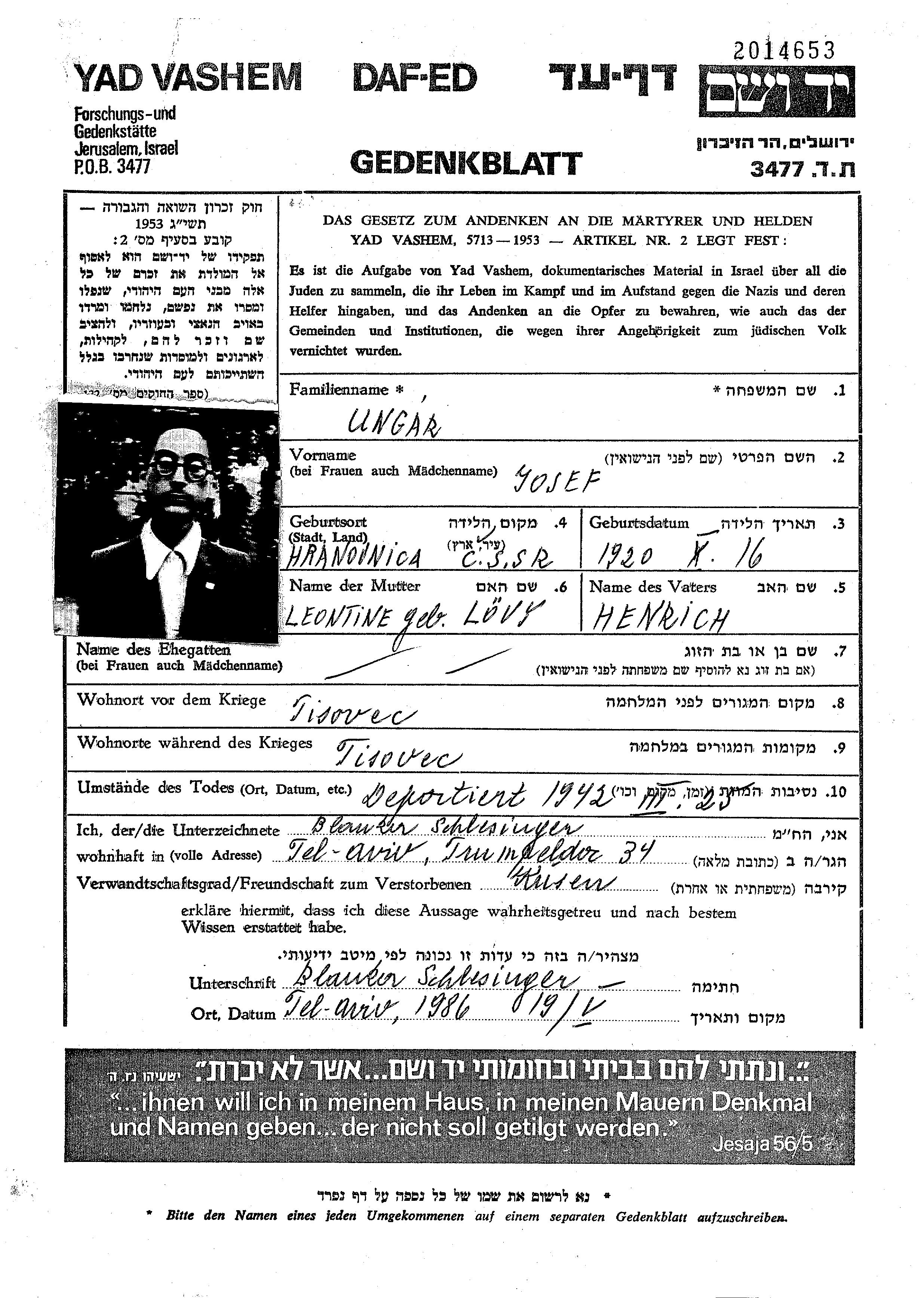 Josef Ungar wurde im Jahr 1920 in Hranovnica, Tschechoslowakei geboren. Vor dem Zweiten Weltkrieg lebte er in Tisovec, Tschechoslowakei.