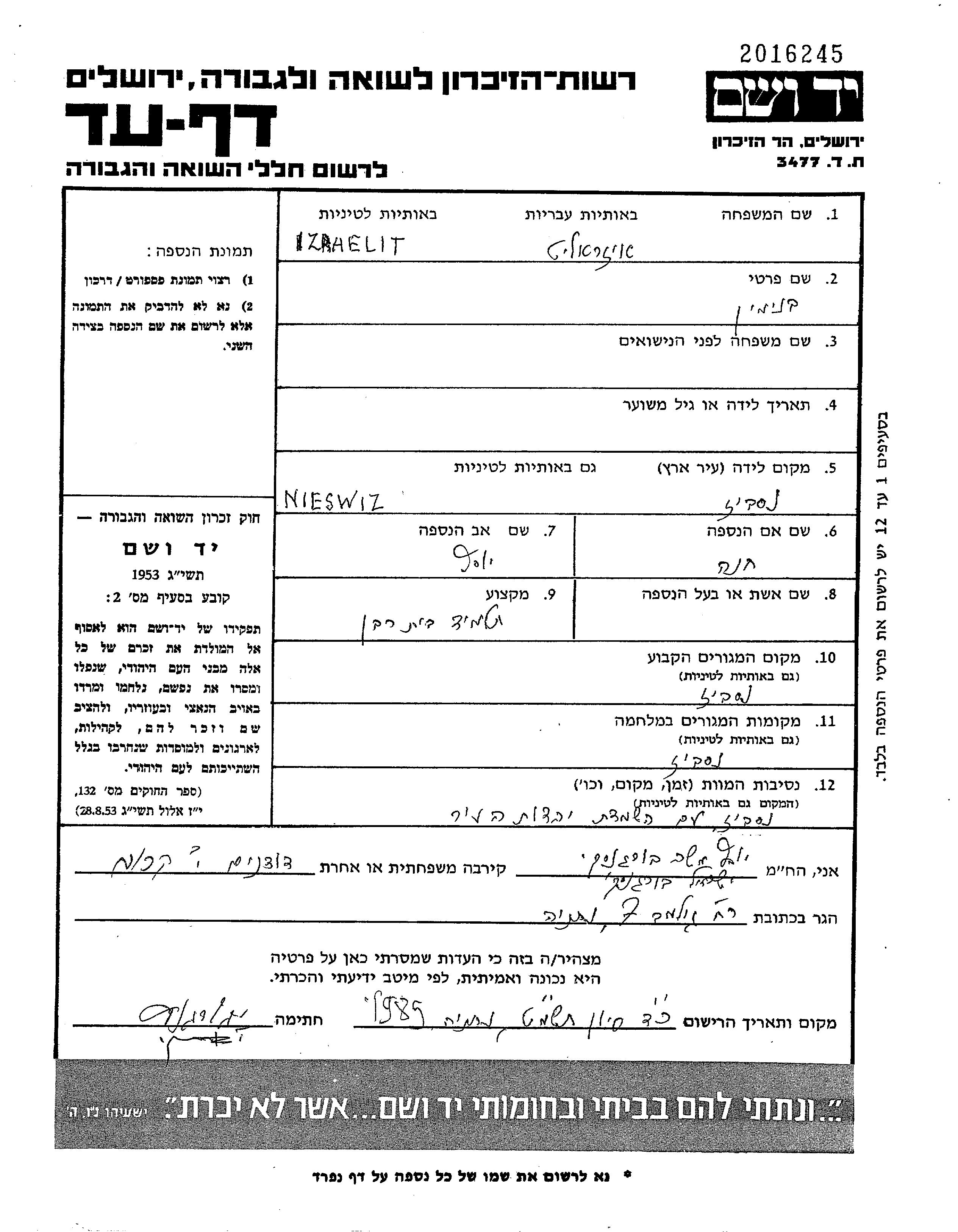 Izraelit Beniamin Nieśwież, Polen Gedenkblatt