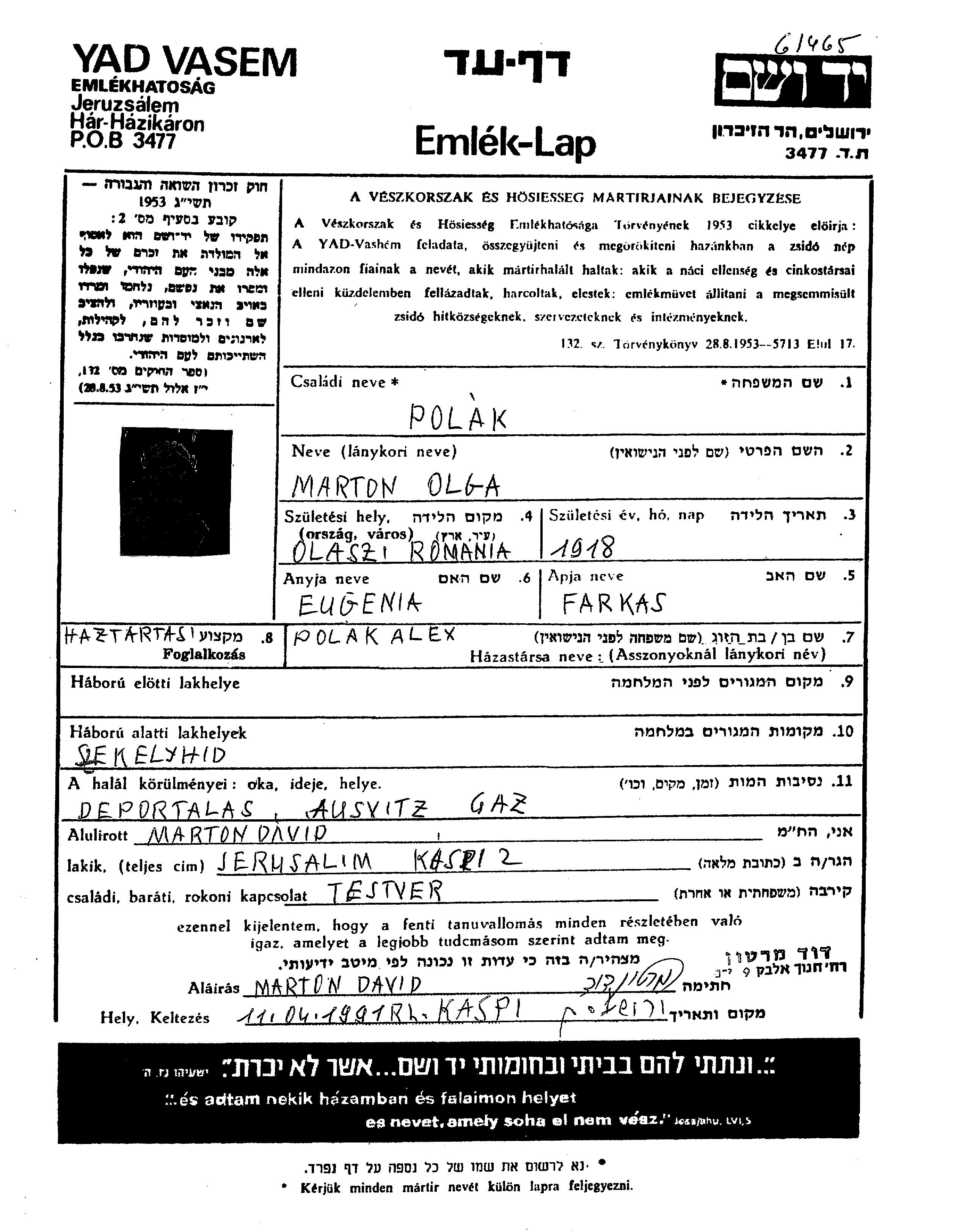 Olga Polak, geb. Marton wurde im Jahr 1918 in Rumänien geboren. Sie war Hausfrau. Vor dem Zweiten Weltkrieg lebte sie in Sacueni, Rumänien.