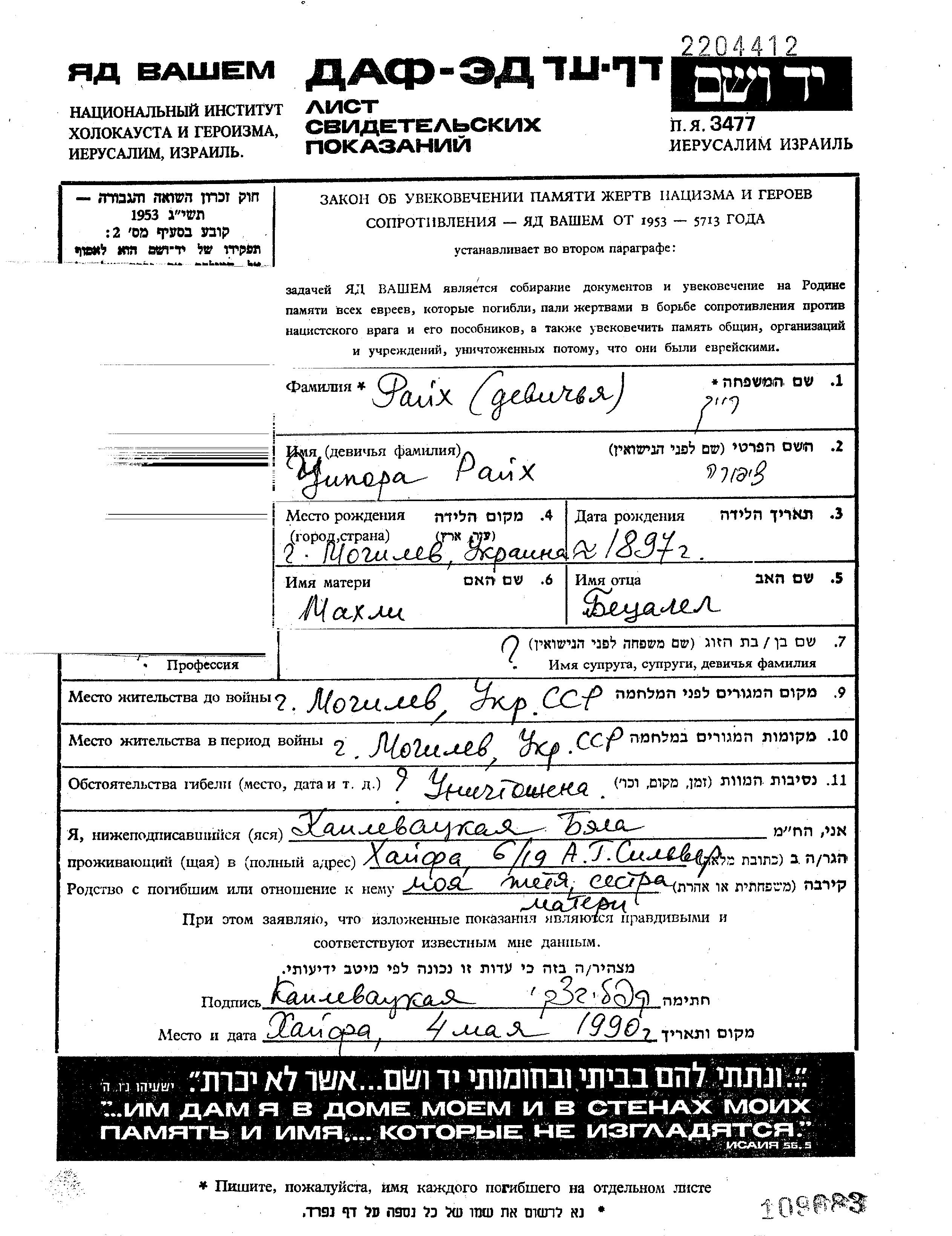 Raich Tzipora 1897 Mogilev Podolski, Ukraine (UdSSR) Gedenkblatt