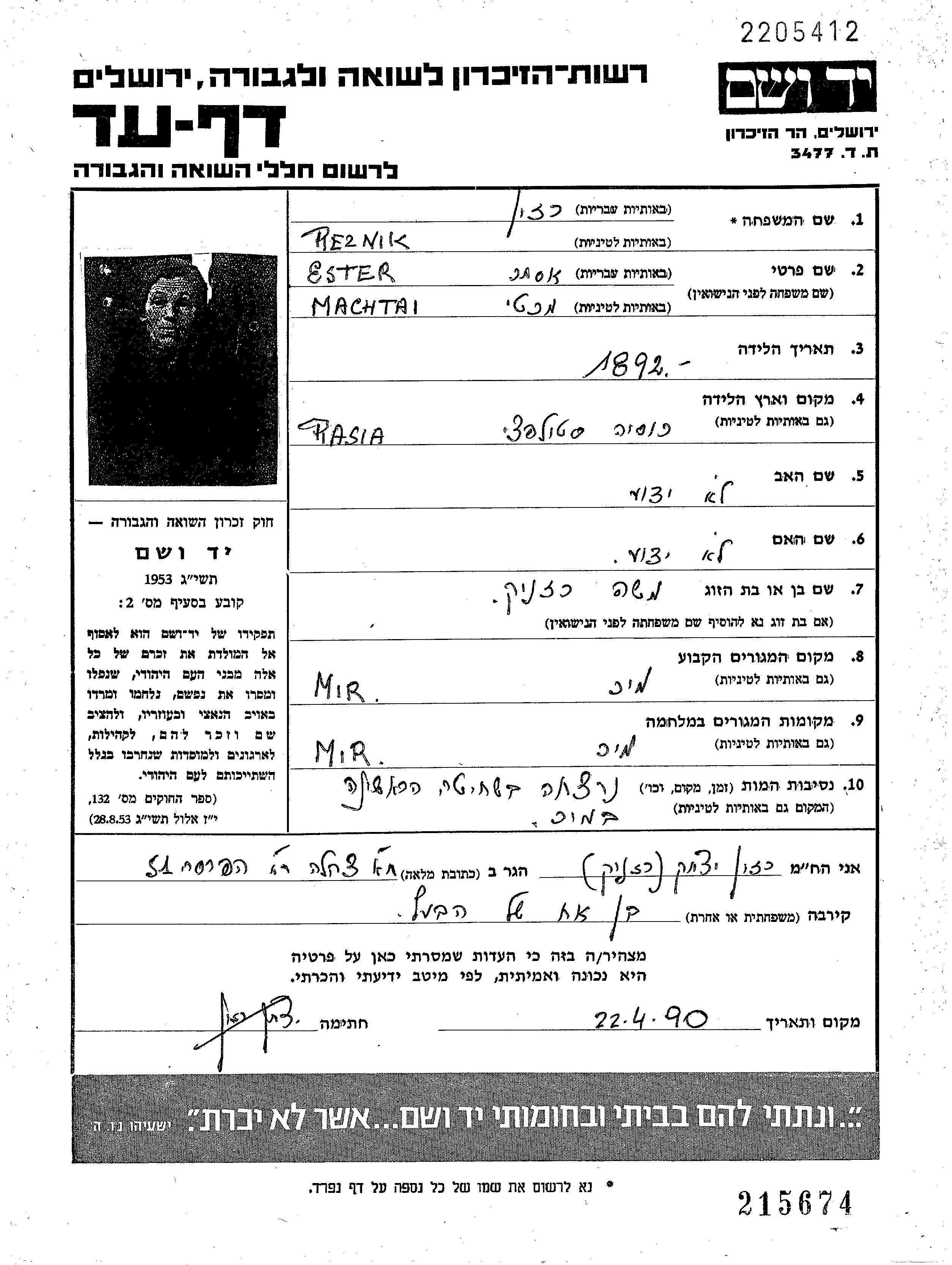 Esther Reznik, geb. Machtai wurde im Jahr 1892 in Stolpce, Polen geboren. Vor dem Zweiten Weltkrieg lebte sie in Mir, Polen.