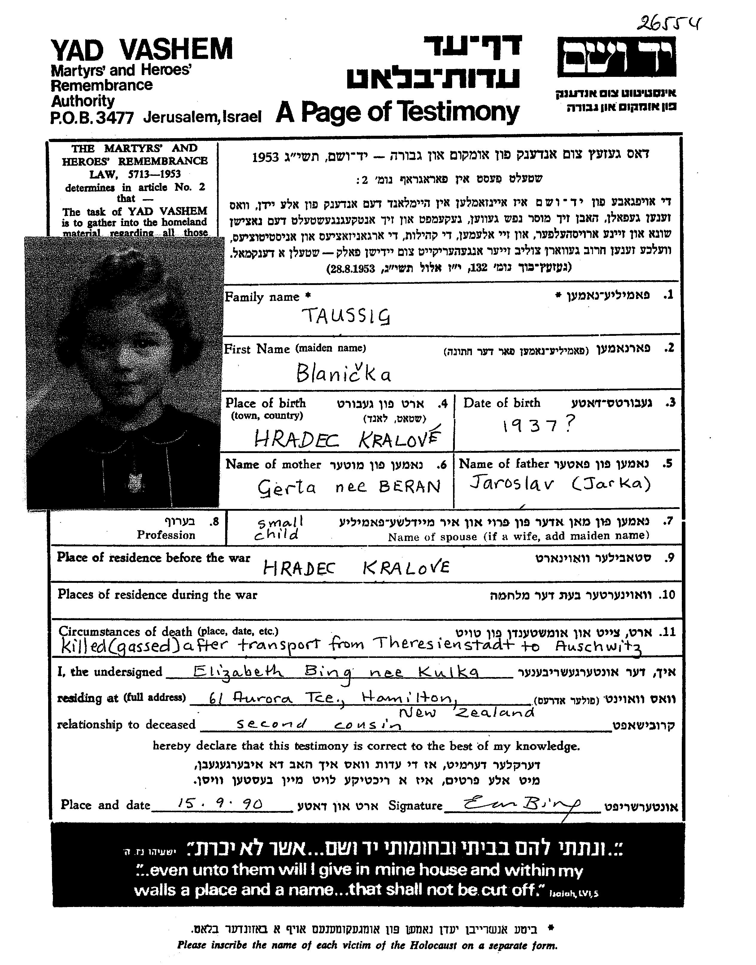Taussig | Blanicka | 1937 | Hradec Kralove, Tschechoslowakei | Gedenkblatt |