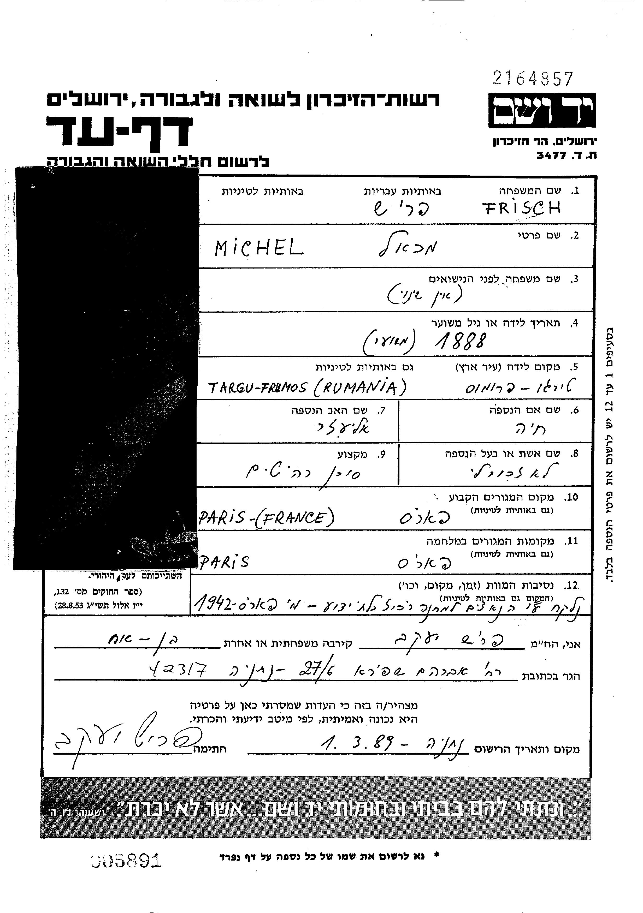 Michel Frisch wurde im Jahr 1888 in Targu Frumos, Rumänien geboren. Er war Kaufmann/-frau. Vor dem Zweiten Weltkrieg lebte er in Paris, Frankreich.