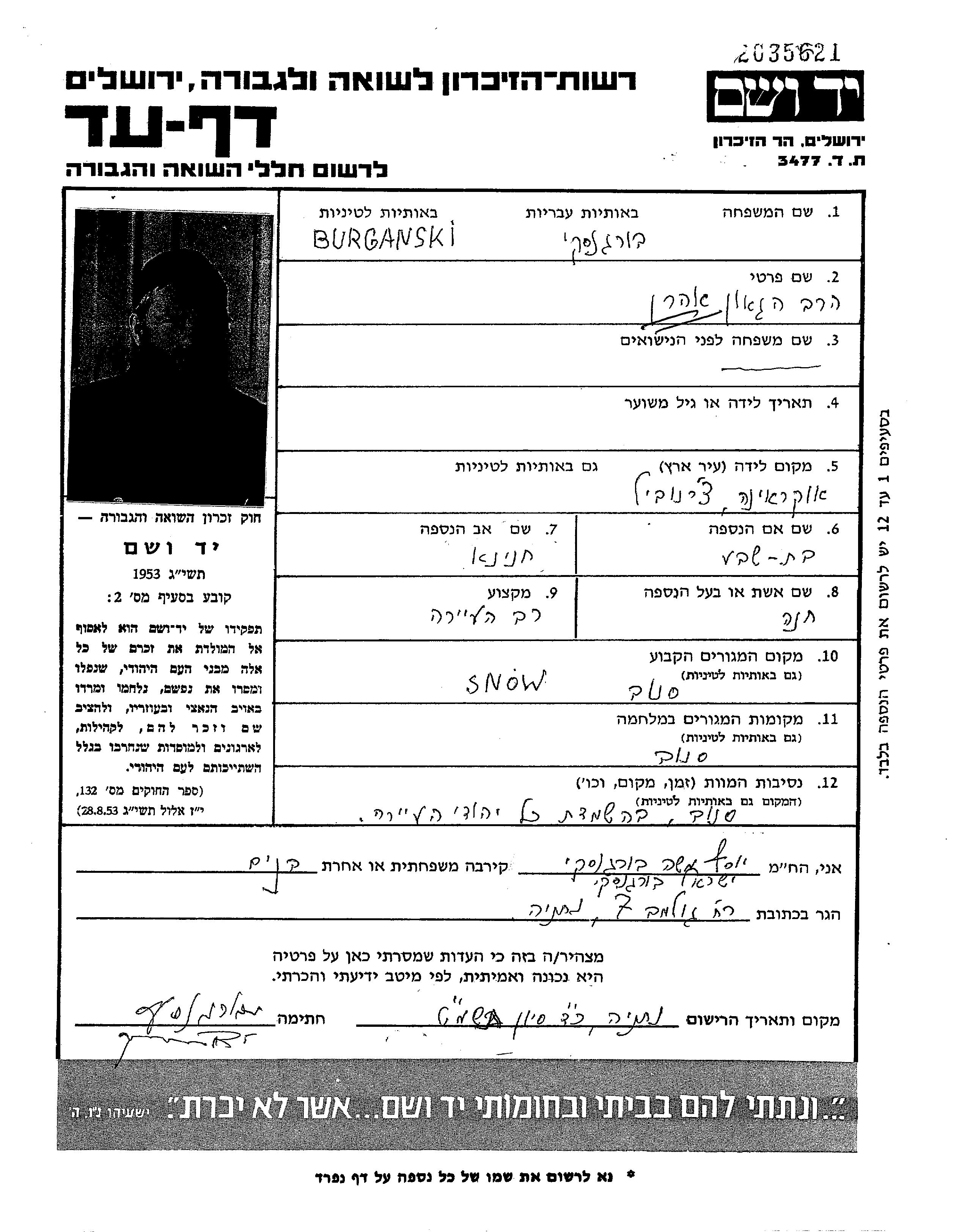 Aharon Burganski wurde in Chernobyl, Ukraine (UdSSR) geboren. Er war Rabbiner. Vor dem Zweiten Weltkrieg lebte er in Snow, Polen.