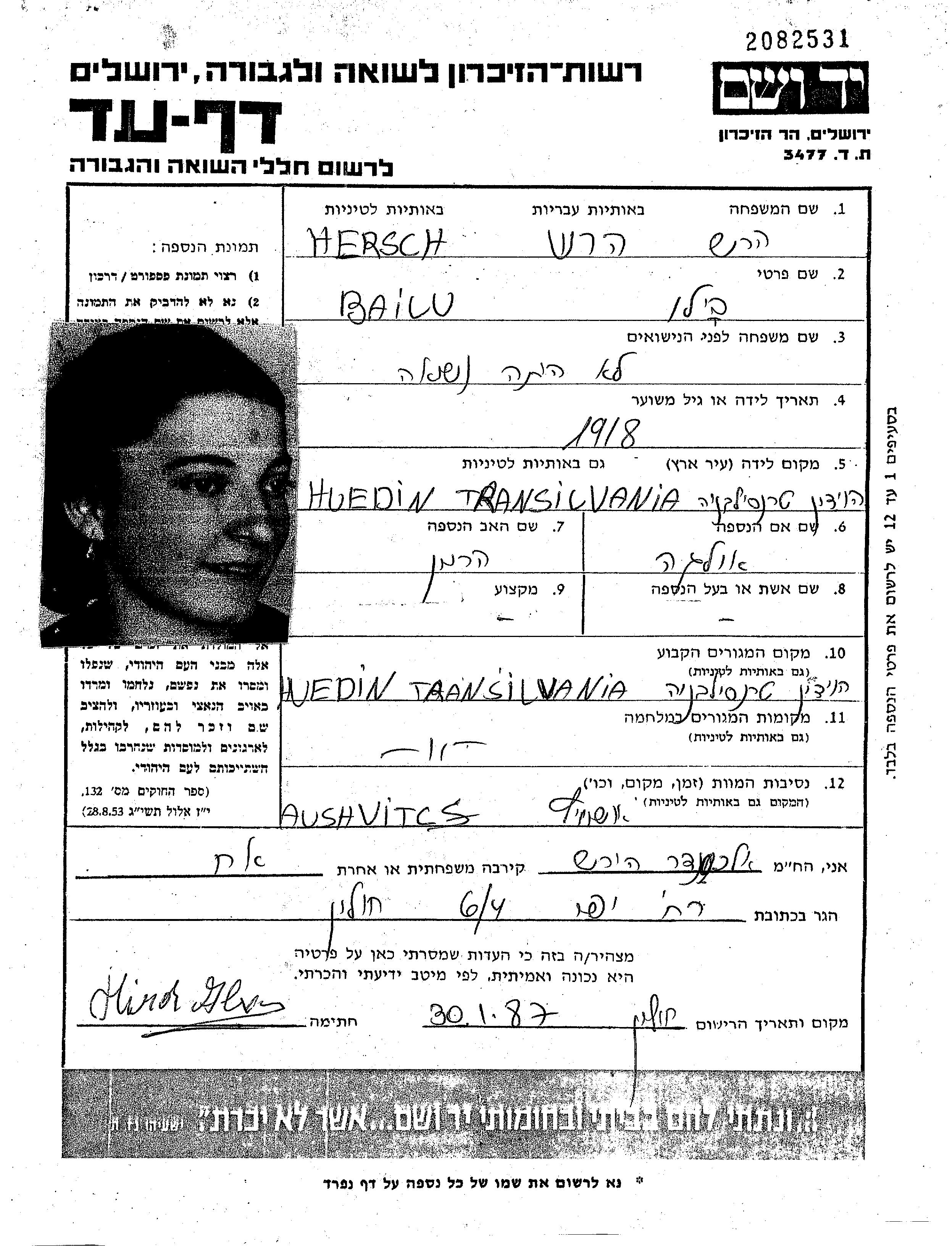 Bela Hersch wurde im Jahr 1918 in Huedin, Rumänien geboren. Vor dem Zweiten Weltkrieg lebte sie in Huedin, Rumänien.