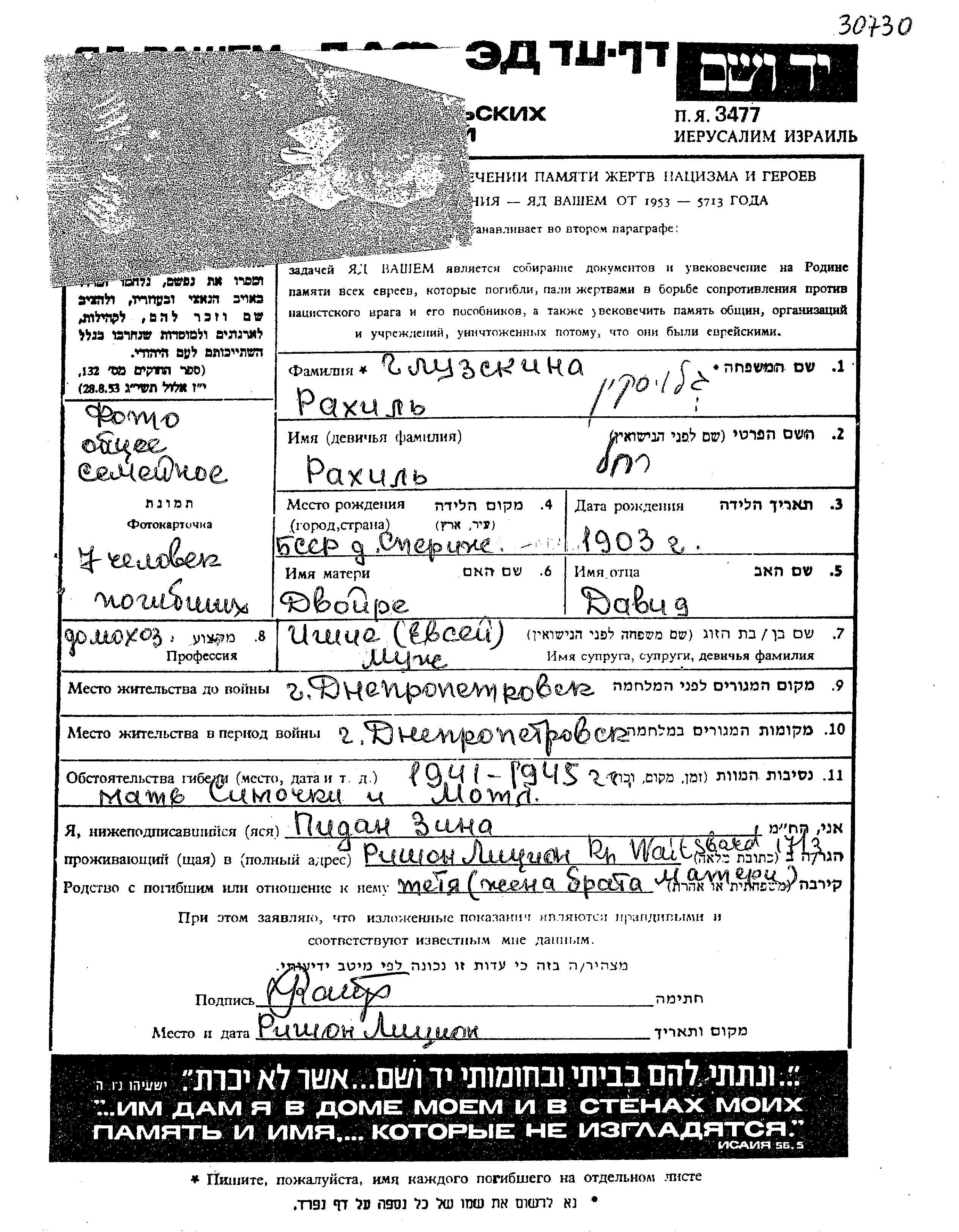 Gluzskin | Rakhil | 1903 | Dnepropetrovsk, Ukraine (UdSSR) | Gedenkblatt |