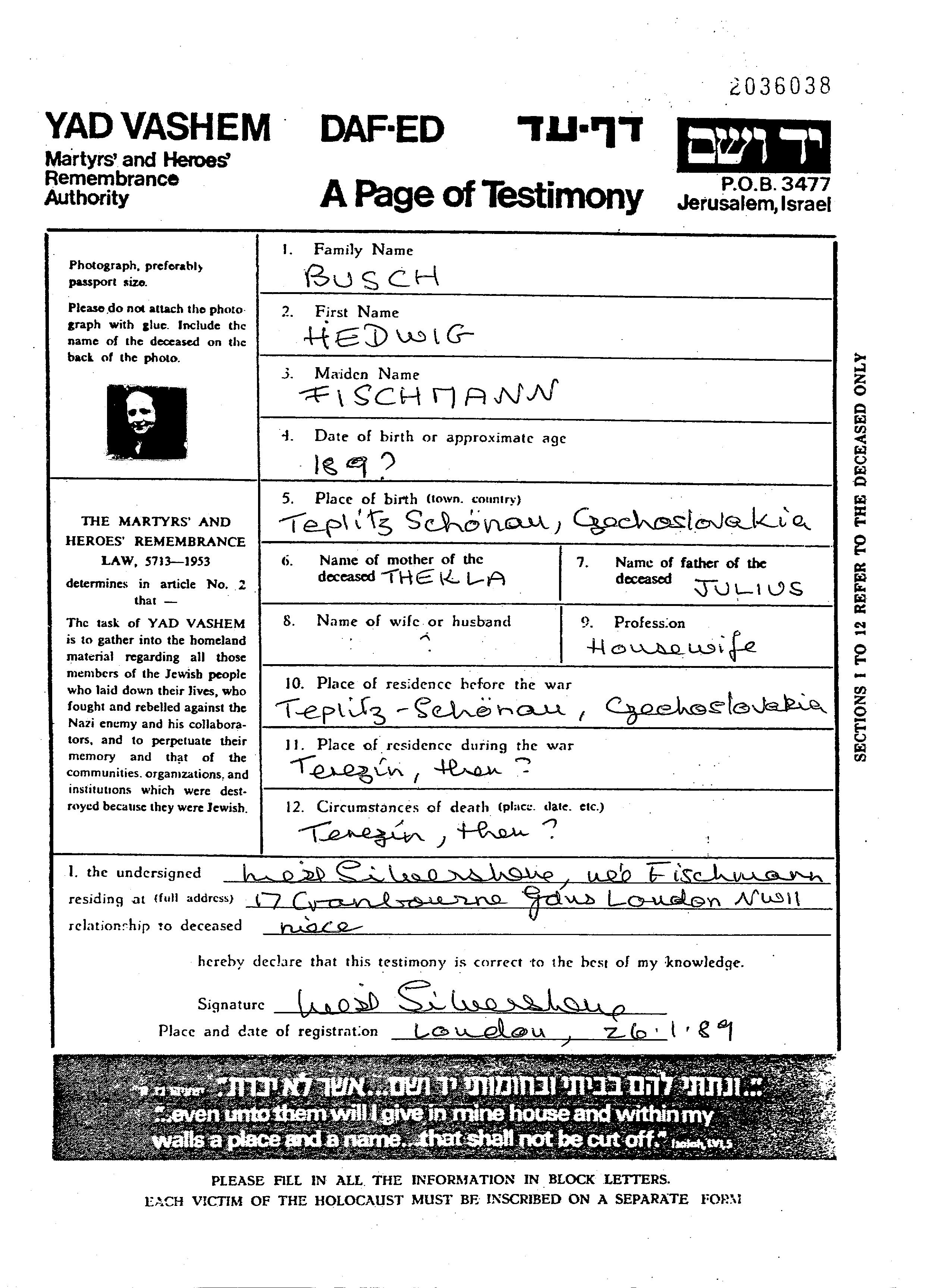 Busch | Hedwig | 1890 | Teplitz, Tschechoslowakei | Gedenkblatt |