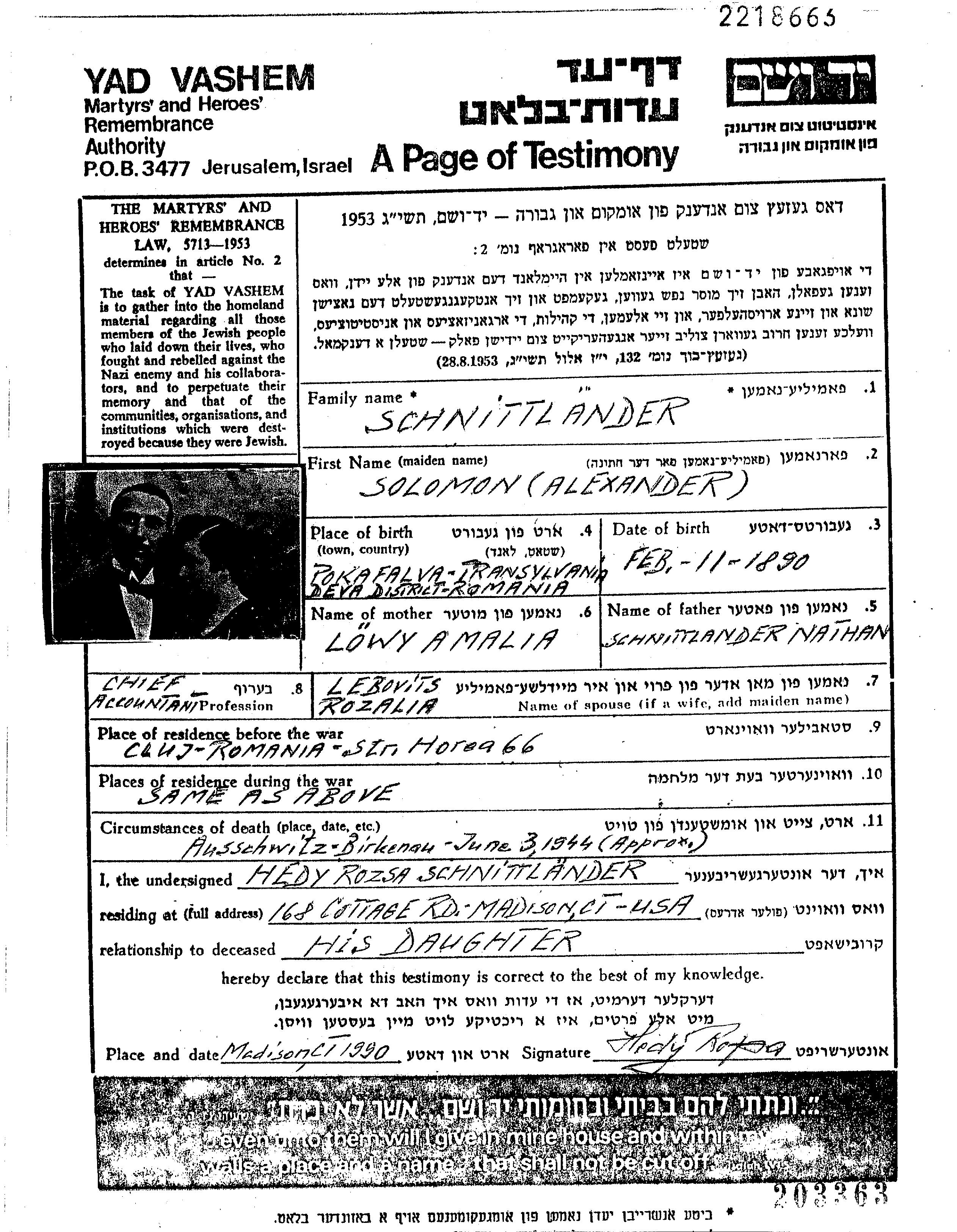 Solomon Alexsander Schnittlaender wurde im Jahr 1890 in Pauca, Rumänien geboren. Er war Buchhalter/-in. Vor dem Zweiten Weltkrieg lebte er in Cluj, Rumänien.