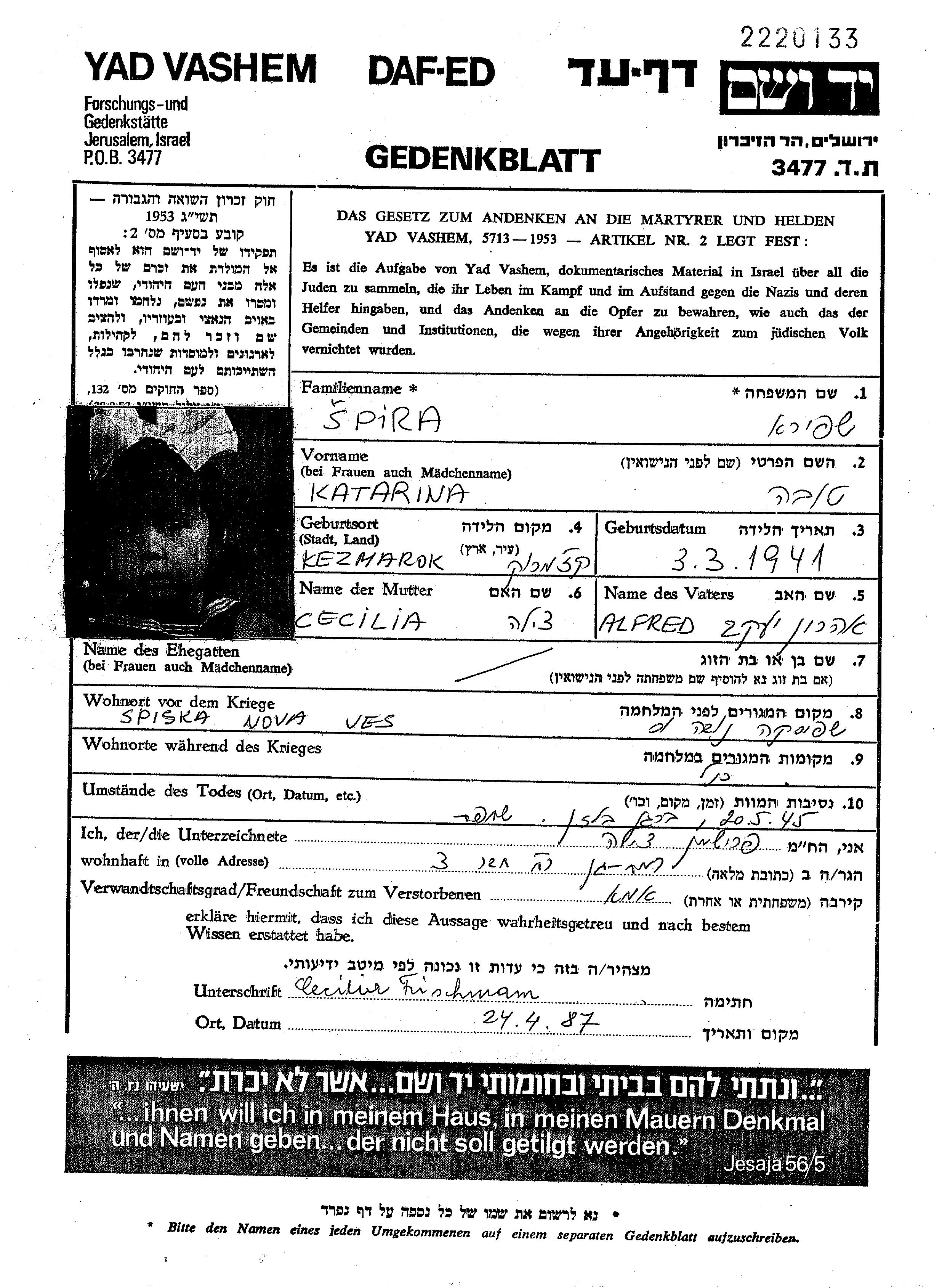 Spira | Katerina | Presov, Tschechoslowakei | Gedenkblatt |