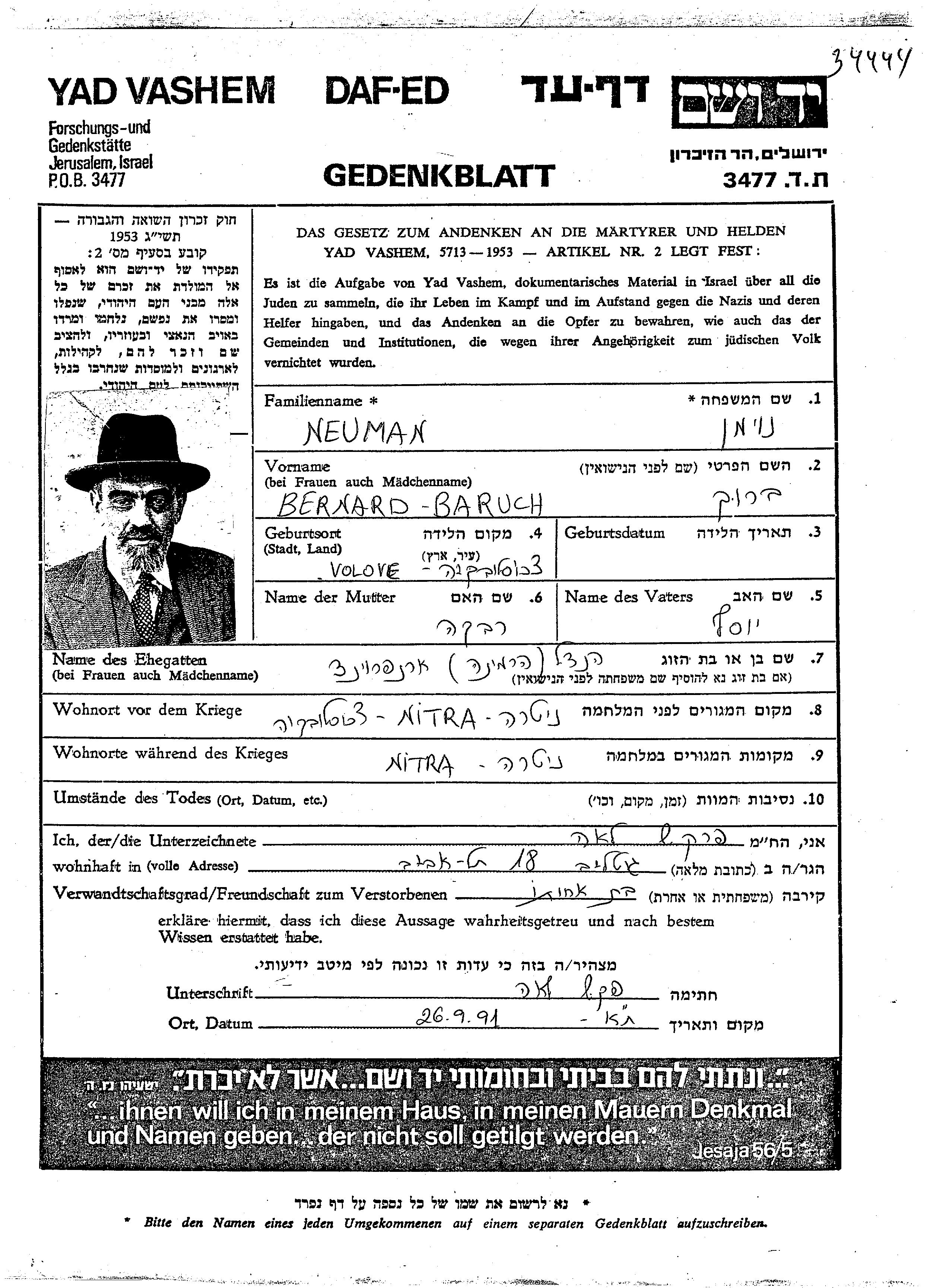 Baruch Bernard Neuman wurde in Volove, Tschechoslowakei geboren. Vor dem Zweiten Weltkrieg lebte er in Nitra, Tschechoslowakei.