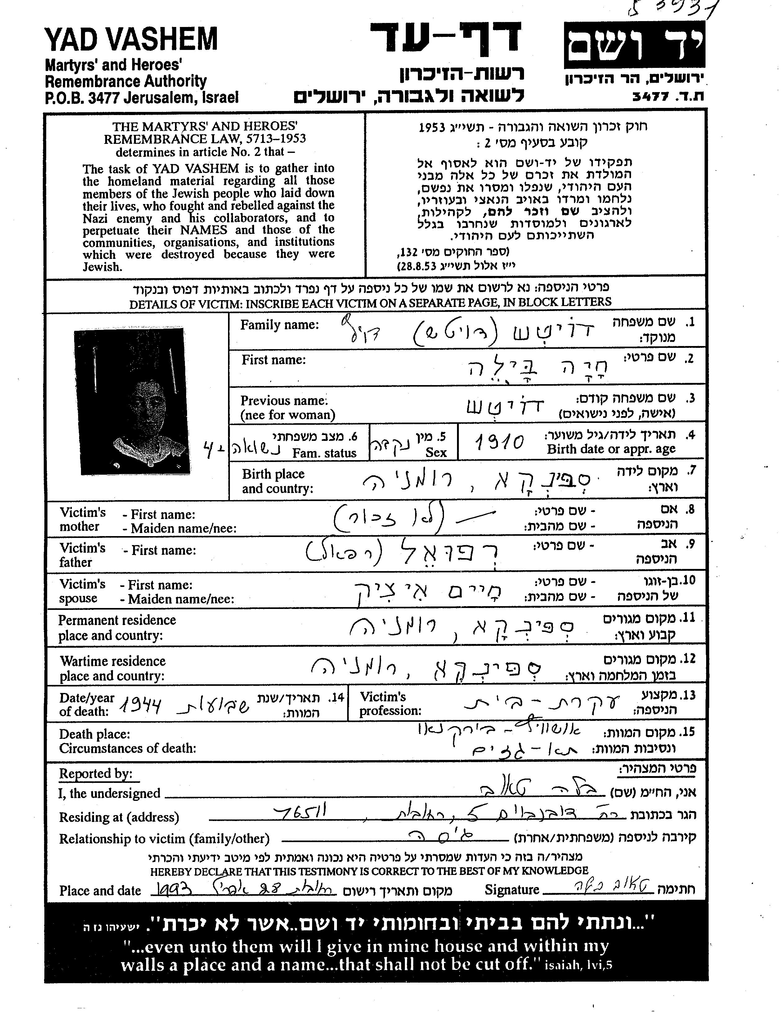 Beila Khaia Deutsch wurde im Jahr 1910 in Sapanta, Rumänien geboren. Sie war Hausfrau. Vor dem Zweiten Weltkrieg lebte sie in Sapanta, Rumänien.