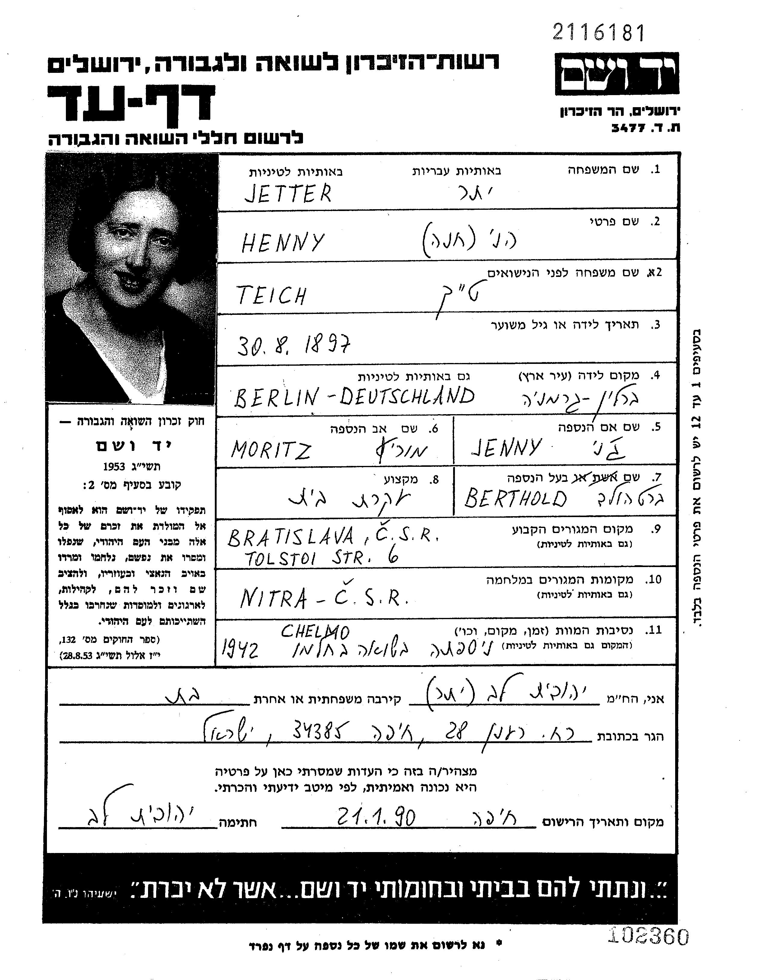Henny Jetter, geb. Teich wurde im Jahr 1897 in Berlin, Deutsches Reich geboren. Sie war Hausfrau. Vor dem Zweiten Weltkrieg lebte sie in Bratislava, Tschechoslowakei.