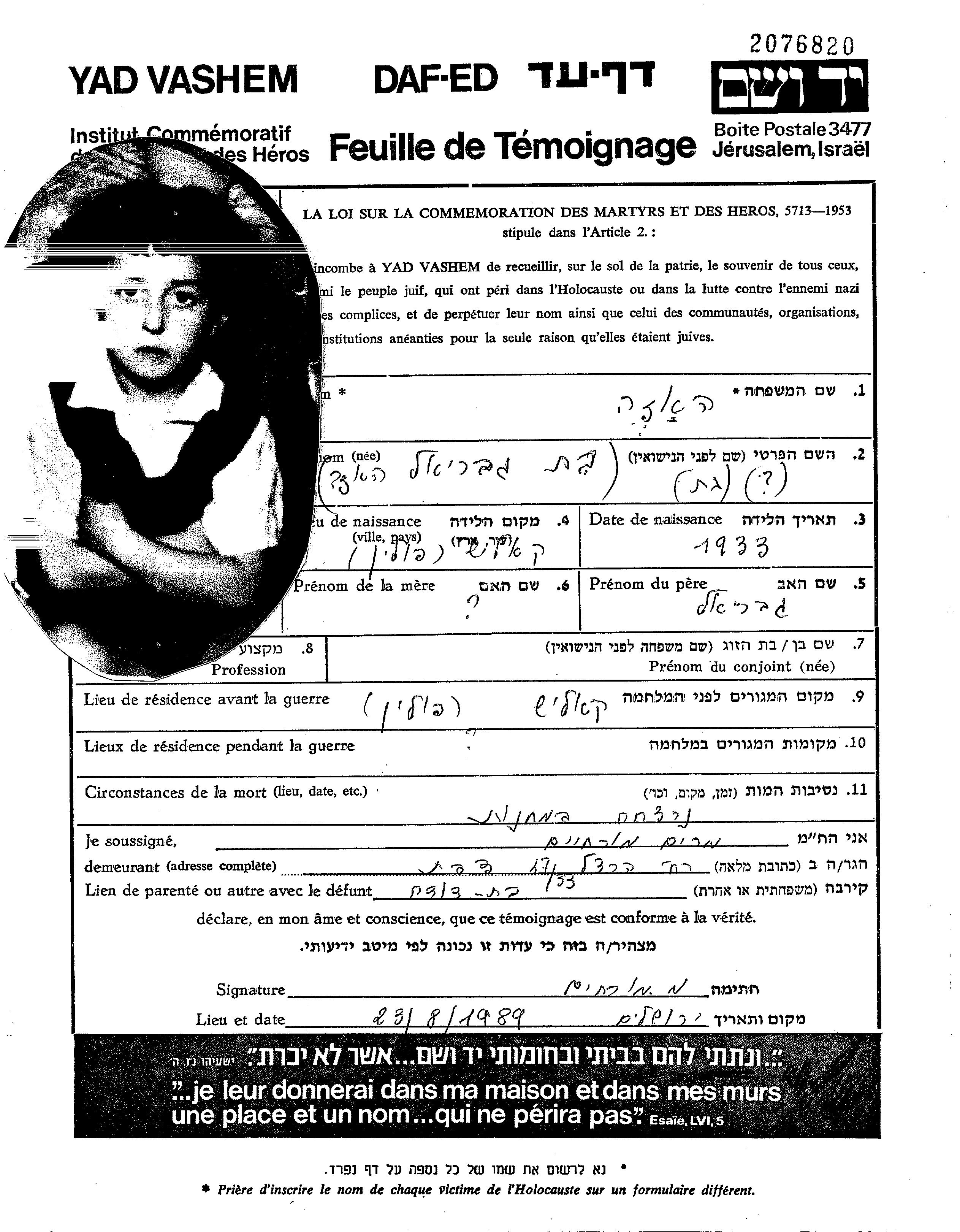 Vorname unbekannt Haze wurde in Kalisz, Polen geboren. Vor dem Zweiten Weltkrieg lebte sie in Kalisz, Polen.