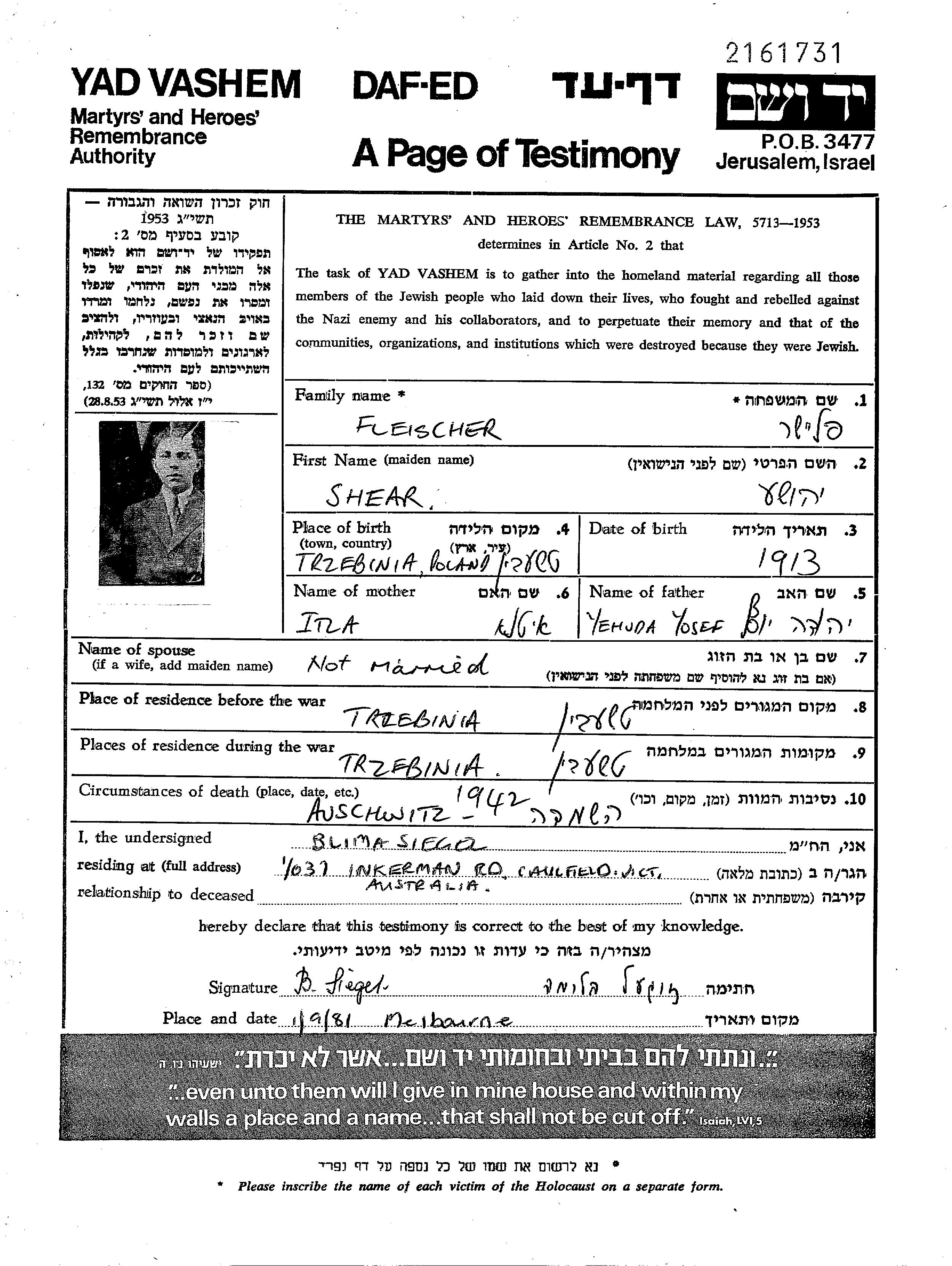 Shear Yehoshua Fleischer wurde im Jahr 1913 in Trzebinia, Polen geboren. Vor dem Zweiten Weltkrieg lebte er in Trzebinia, Polen.