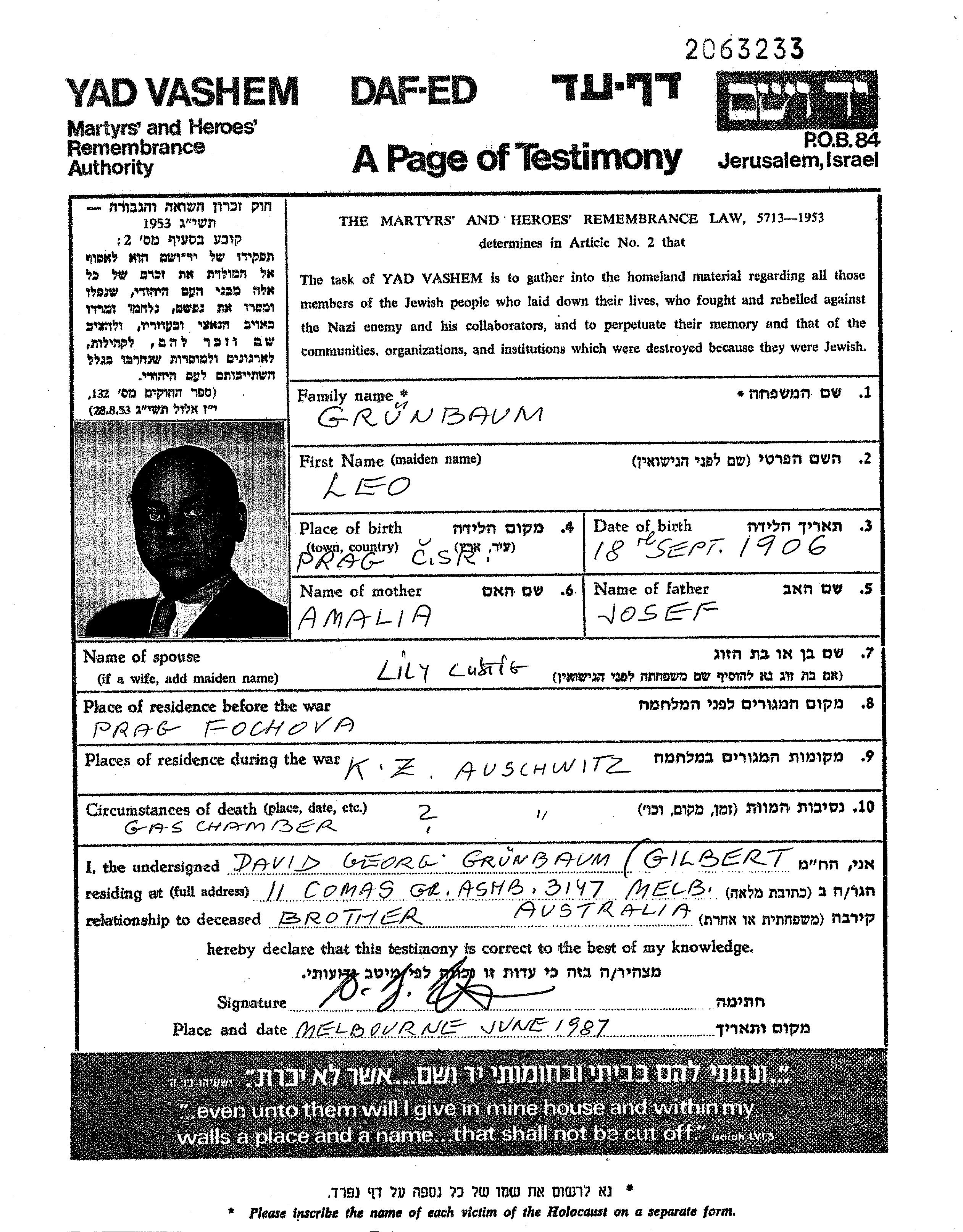 Leo Grünbaum wurde im Jahr 1906 in Praha, Tschechoslowakei geboren. Vor dem Zweiten Weltkrieg lebte er in Praha, Tschechoslowakei.