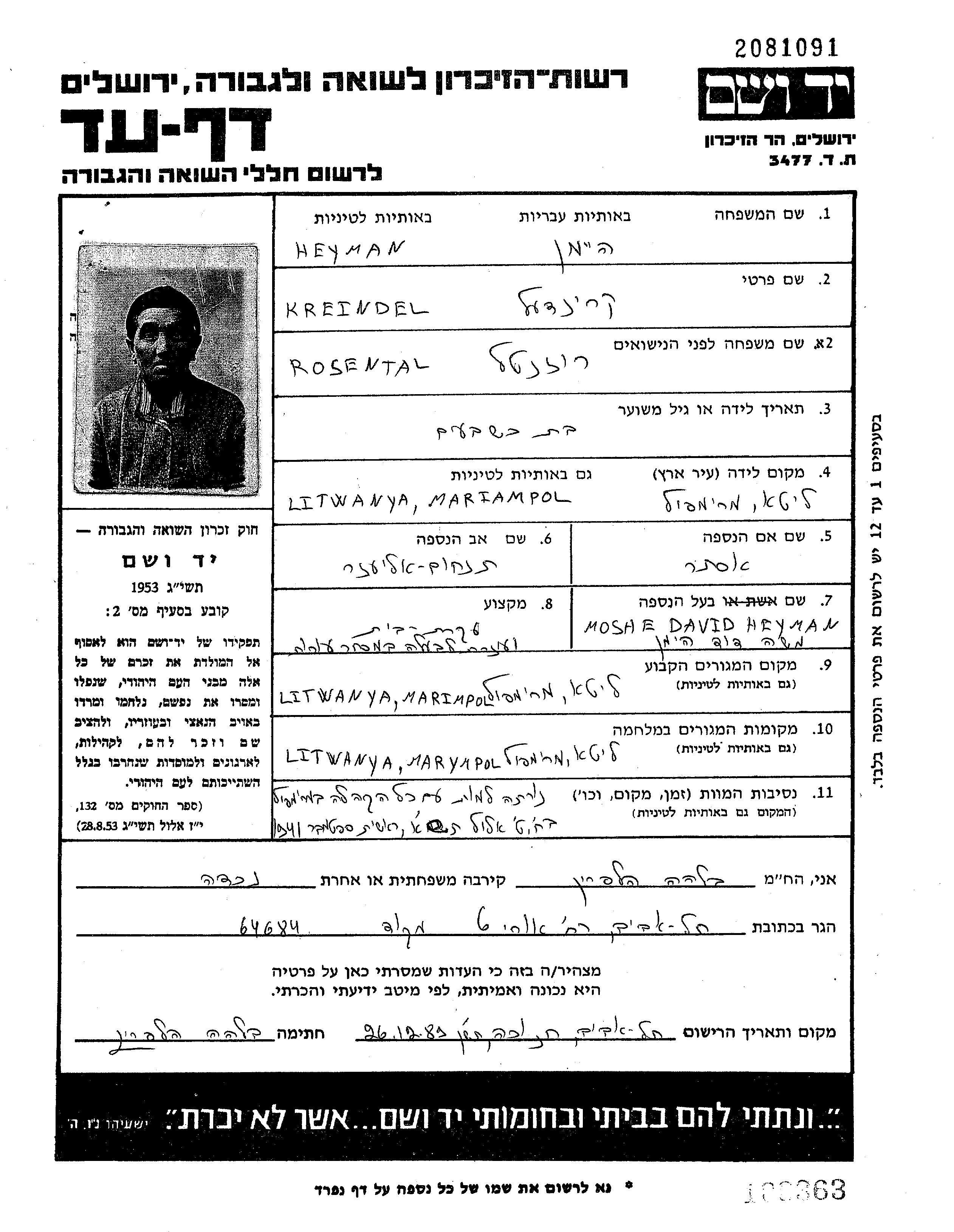 Heyman Kreindel Mariampol, Litauen Gedenkblatt