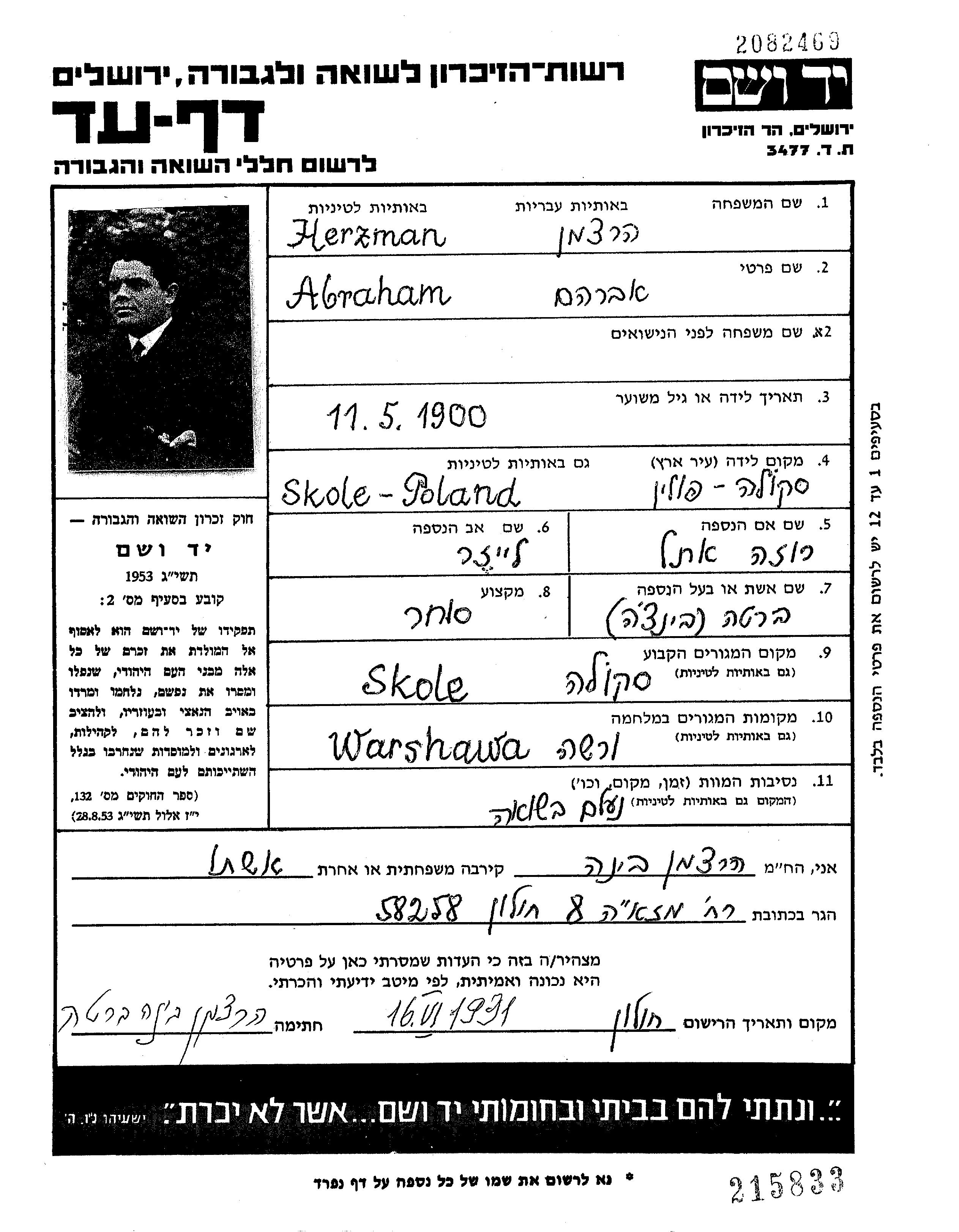 Abraham Herzman wurde im Jahr 1900 in Skole, Polen geboren. Er war Kaufmann/-frau. Vor dem Zweiten Weltkrieg lebte er in Skole, Polen.