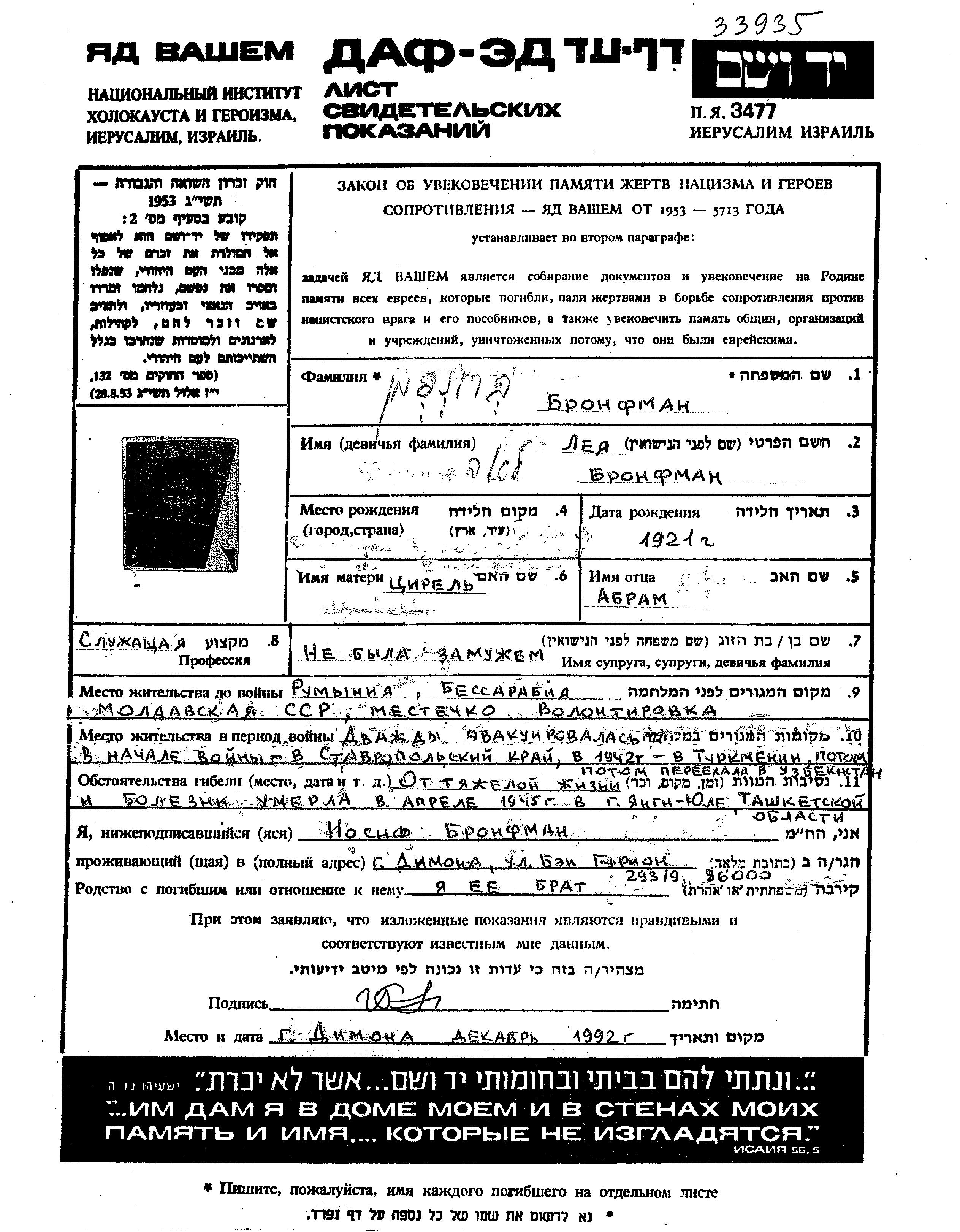Bronfman Lea 1921 Volintiri, Rumänien Gedenkblatt