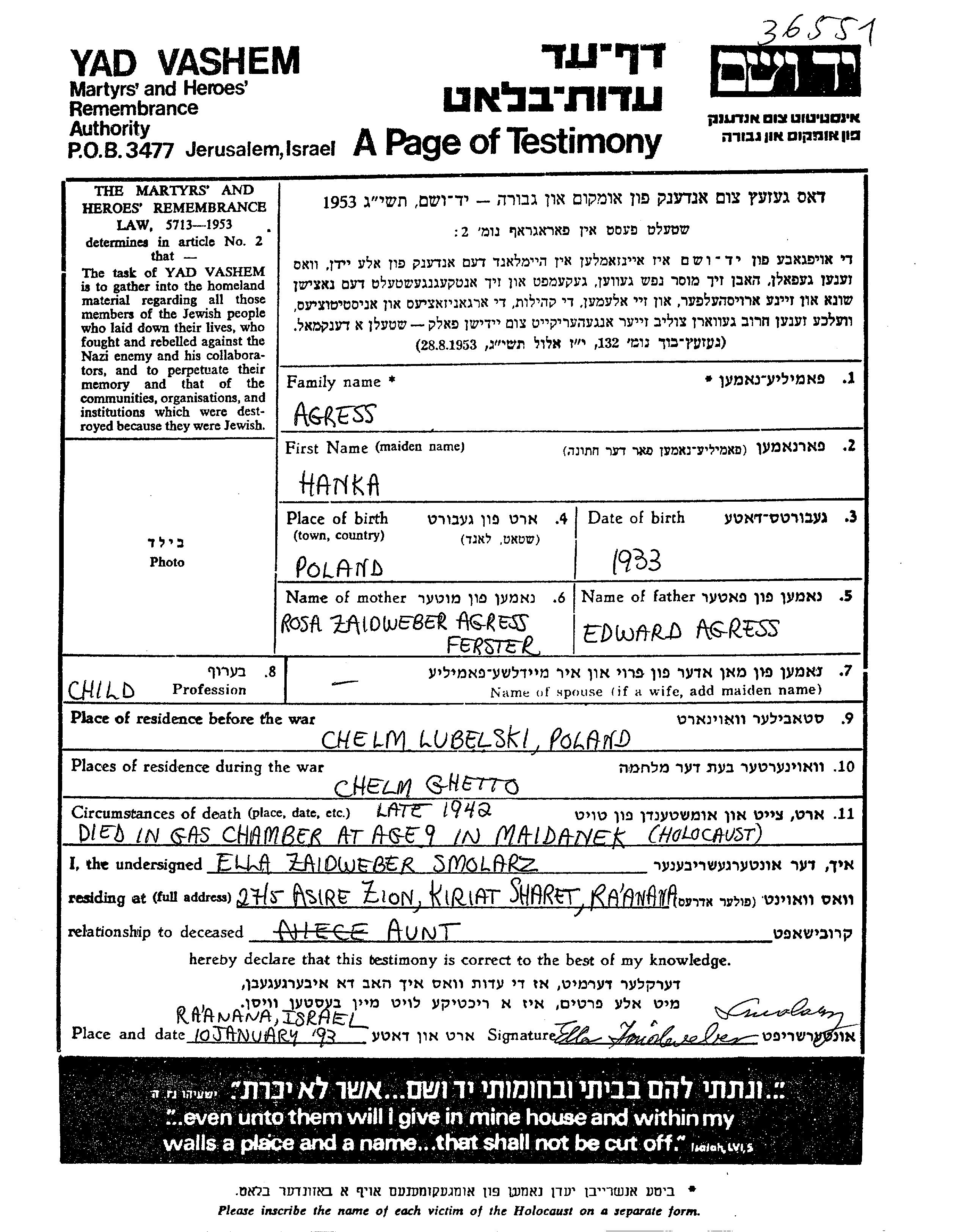 Hanka Agress wurde im Jahr 1933 in Polen geboren. Vor dem Zweiten Weltkrieg lebte sie in Chelm, Polen.