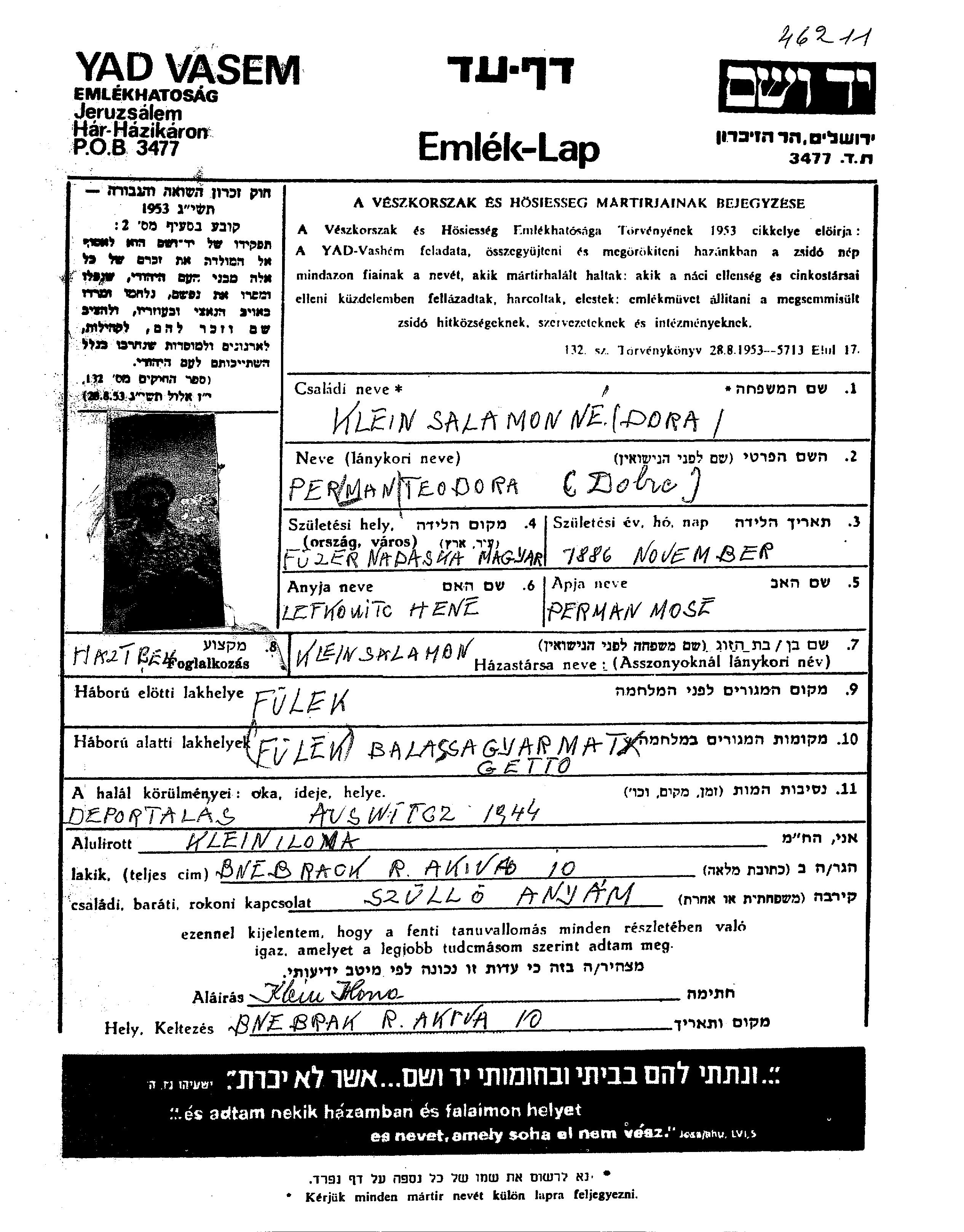 Dora Dvora Klein wurde im Jahr 1886 in Trstany, Tschechoslowakei geboren. Sie war Hausfrau. Vor dem Zweiten Weltkrieg lebte sie in Filakovo, Tschechoslowakei.
