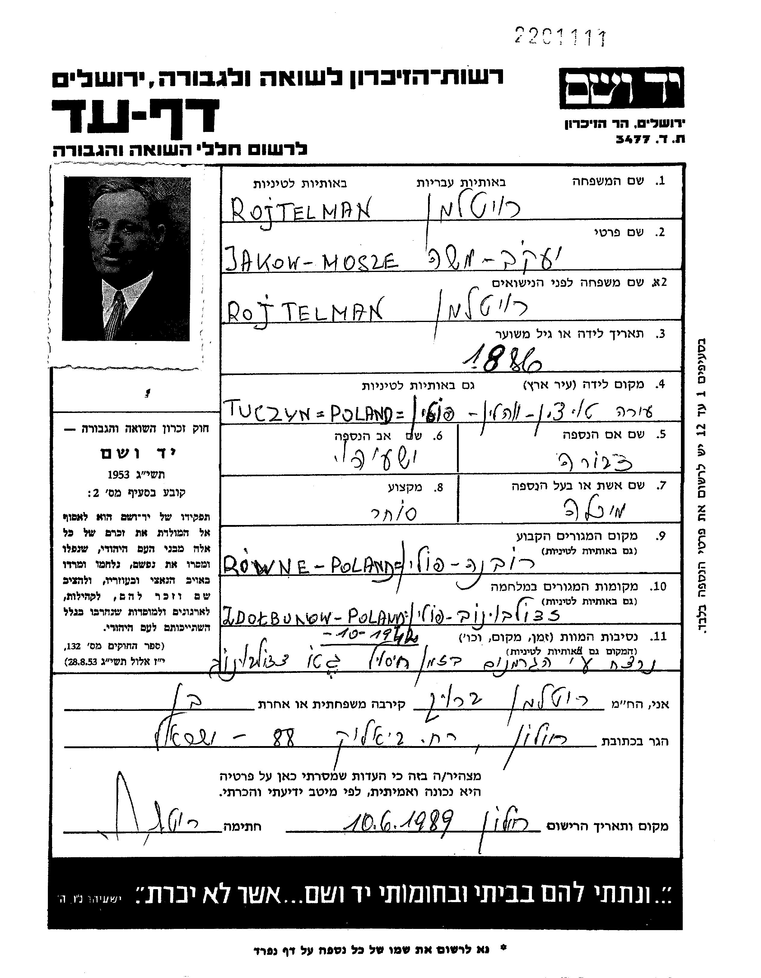 Jakow Mosze Rojtelman wurde im Jahr 1886 in Tuczyn, Polen geboren. Er war Kaufmann/-frau. Vor dem Zweiten Weltkrieg lebte er in Rowne, Polen.