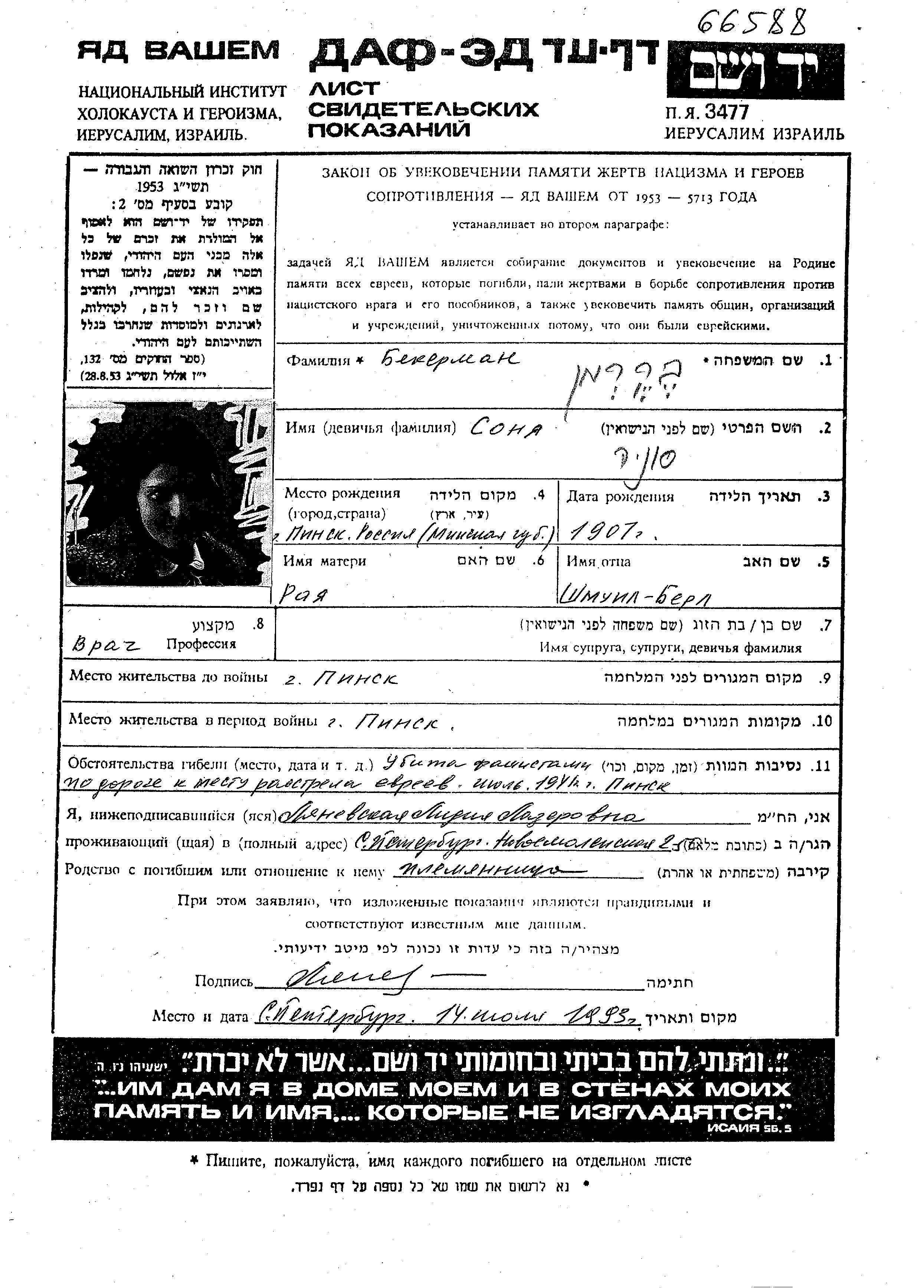 Sonia Bekerman wurde im Jahr 1907 in Pinsk, Polen geboren. Sie war Arzt/ärztin. Vor dem Zweiten Weltkrieg lebte sie in Pinsk, Polen.
