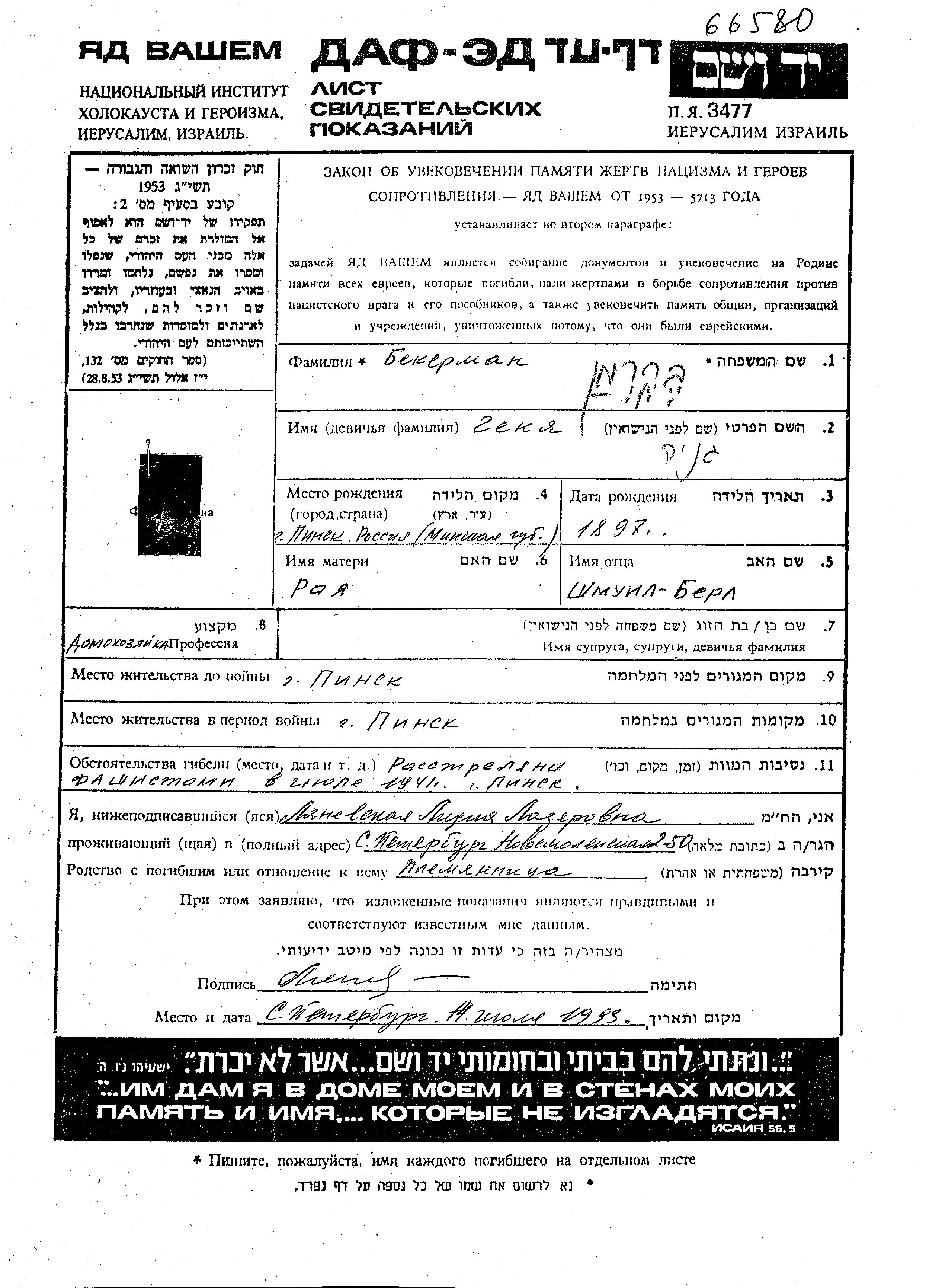 Genia Bekerman wurde im Jahr 1897 in Pinsk, Polen geboren. Sie war Hausfrau. Vor dem Zweiten Weltkrieg lebte sie in Pinsk, Polen.