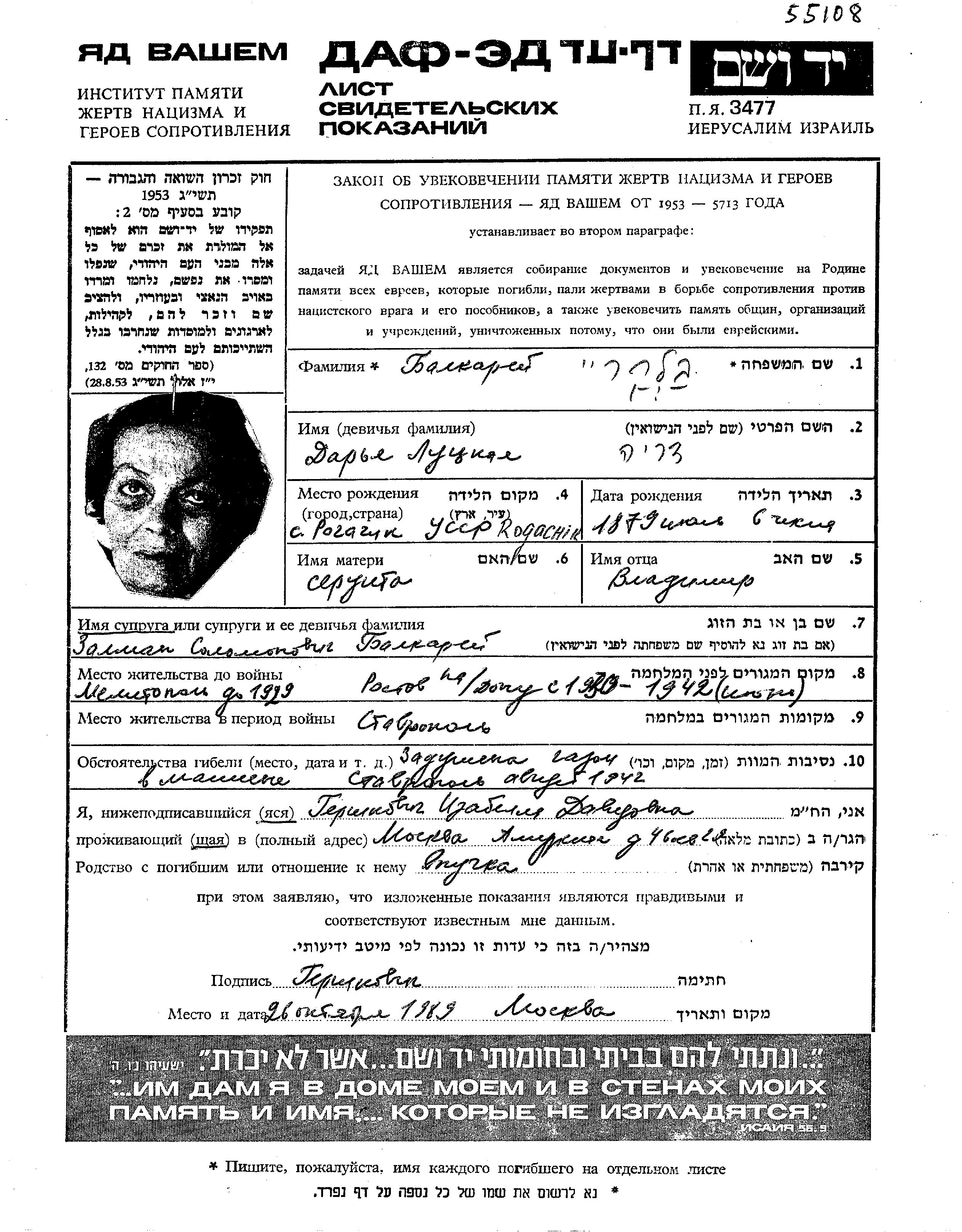 Daria wurde in der Schoah ermordet. Todesort: Voroshilovsk, Russland (UdSSR) im Jahr 1942.