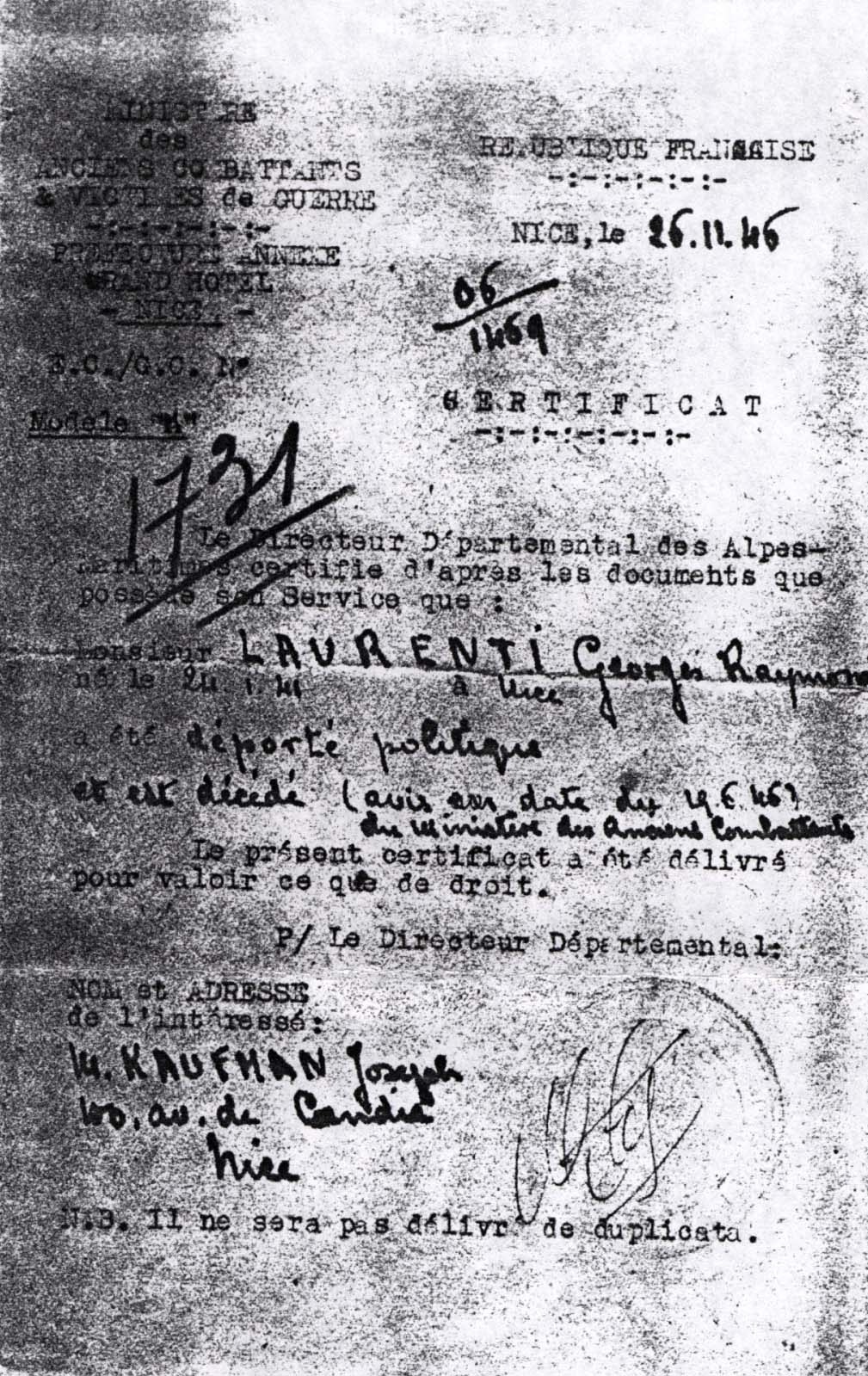 Marguerite Laurenti, geb. Kaufman wurde im Jahr 1922 in Mulhouse, Frankreich geboren. Sie war Schneiderin. Vor dem Zweiten Weltkrieg lebte sie in Nice, Frankreich. Marguerite wurde in der Schoah ermordet. Todesort: Auschwitz, Polen im Jahr 10/03/1944.