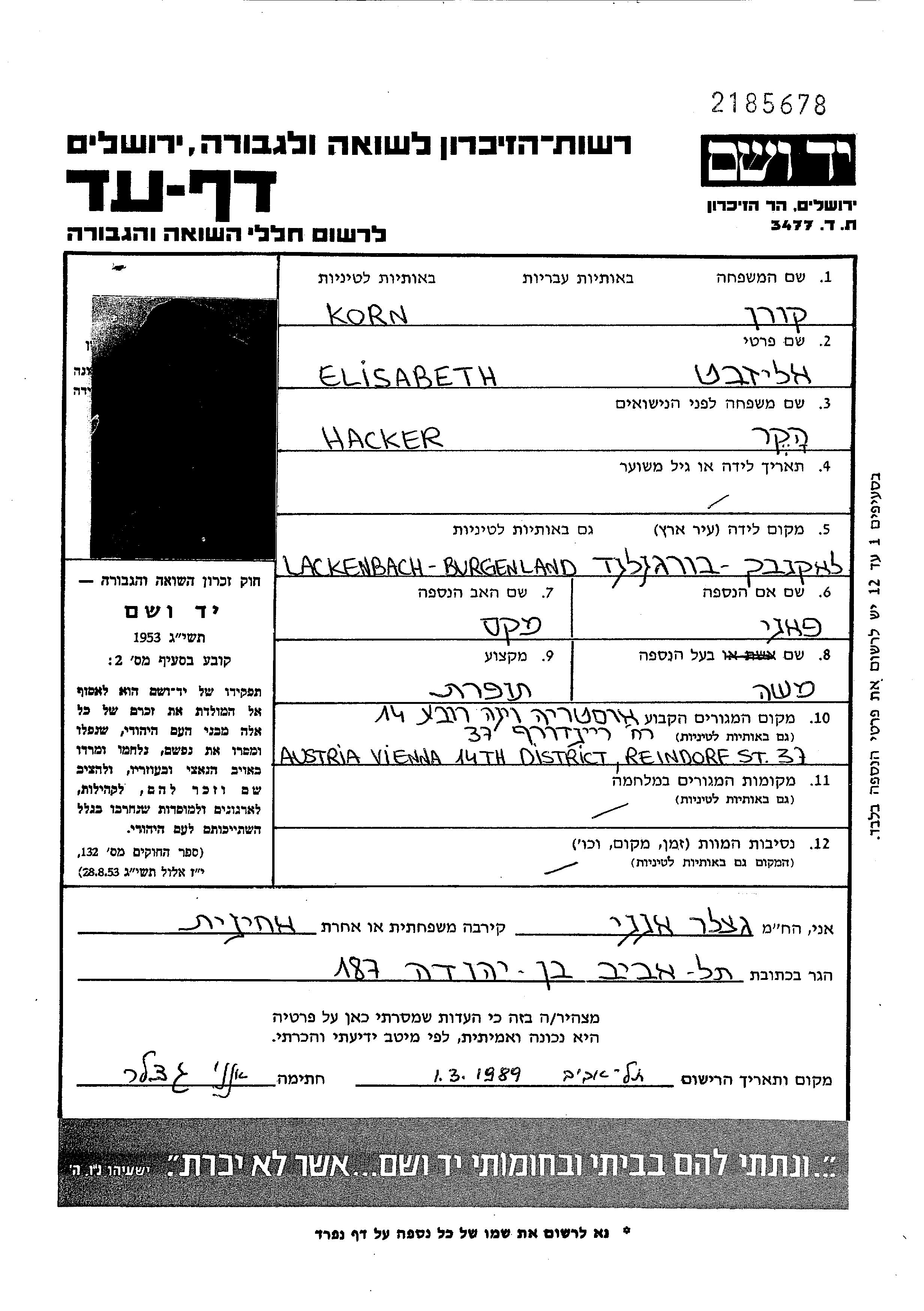 Elisabeth Korn, geb. Hacker wurde in Lackenbach, Österreich geboren. Sie war Schneiderin. Vor dem Zweiten Weltkrieg lebte sie in Wien, Österreich.