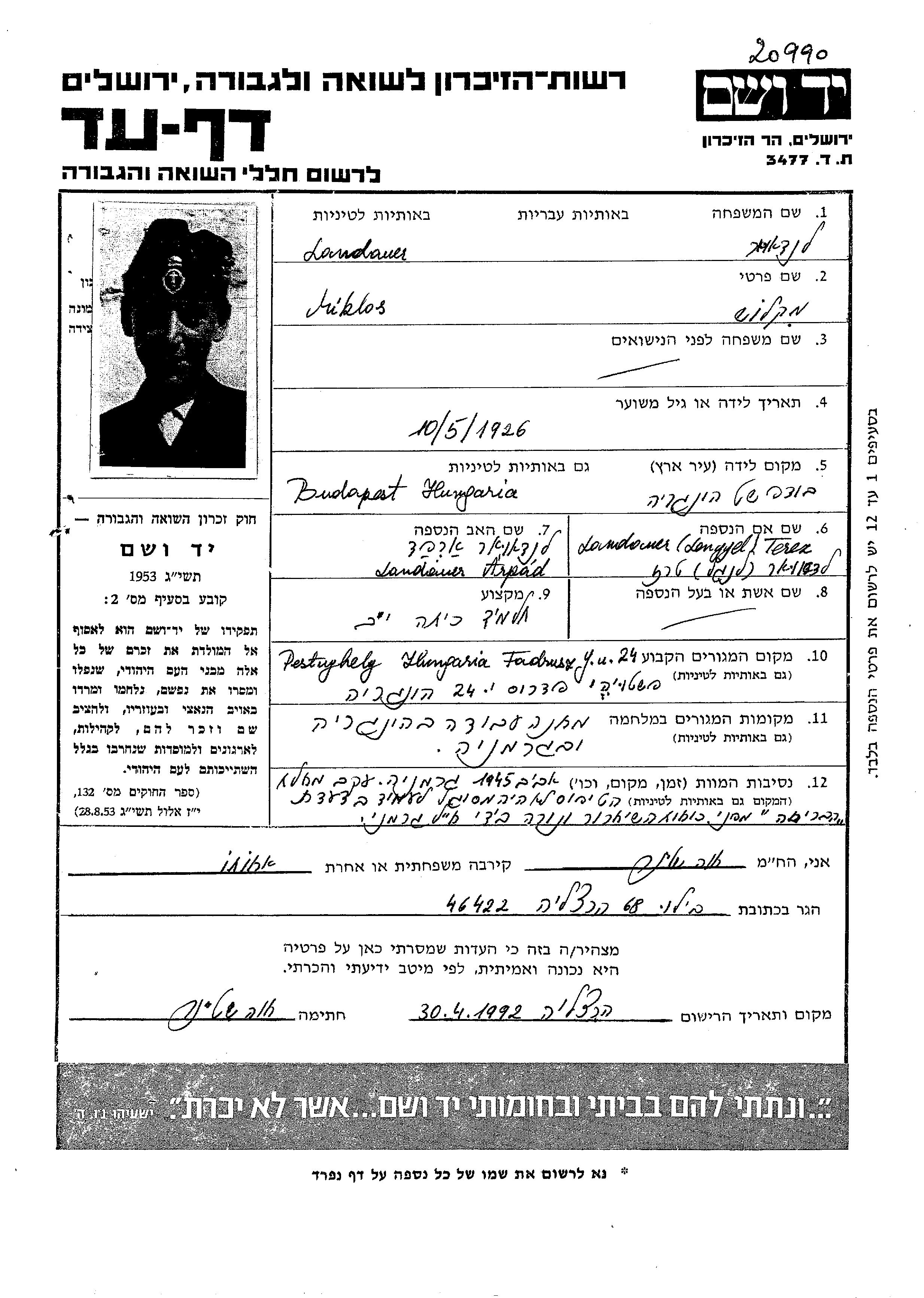 Landauer Miklos 1926 Budapest, Ungarn Gedenkblatt