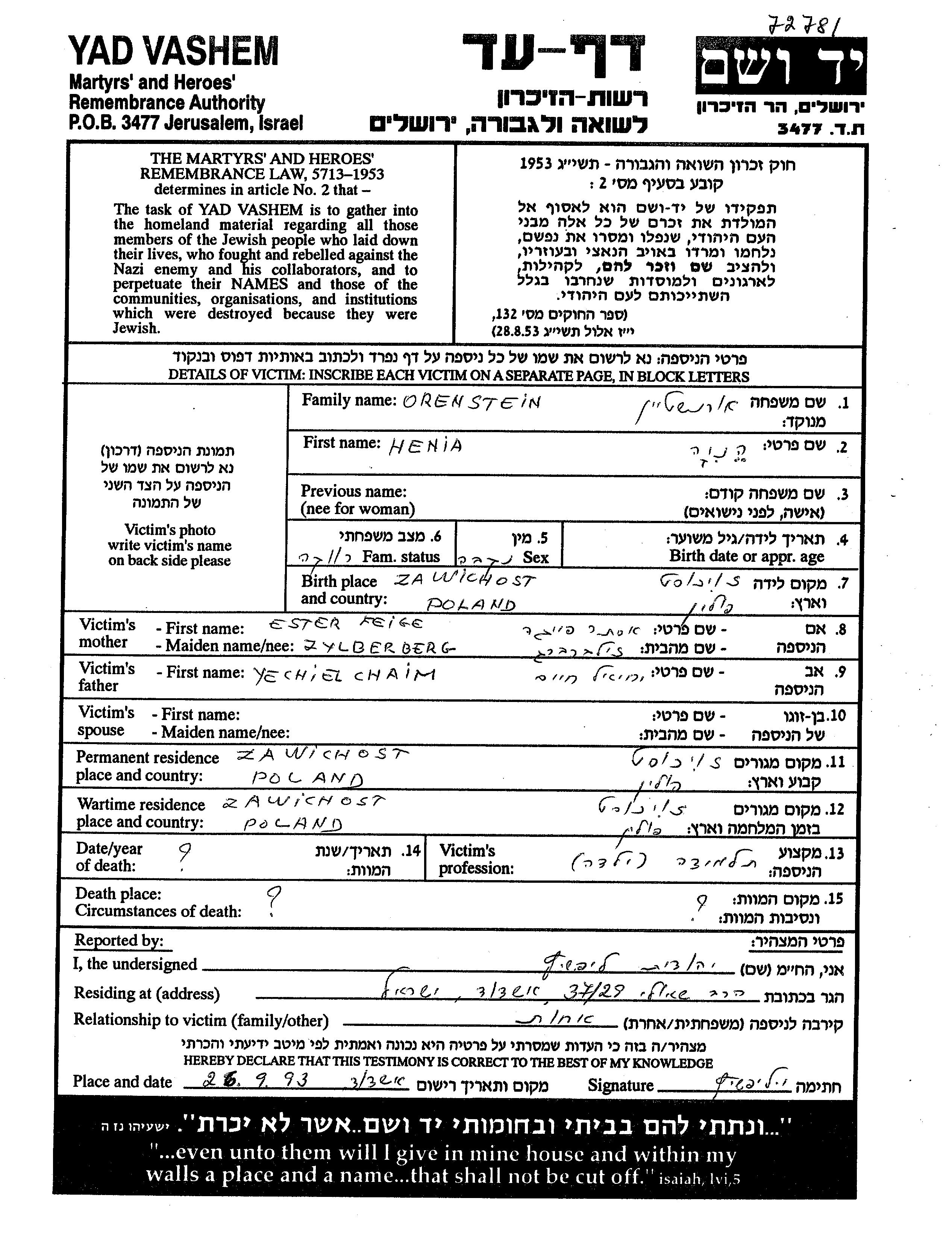Orenstein Henia Zawichost, Polen Gedenkblatt