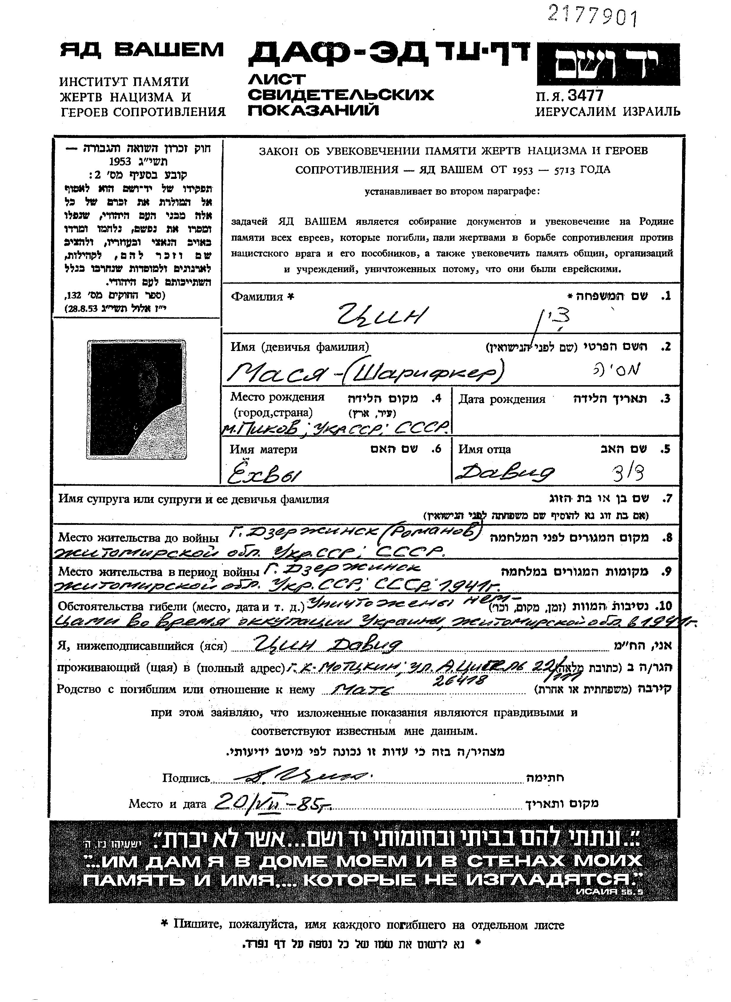 Masya wurde in der Schoah ermordet. Todesort: Dzerzhinsk, Ukraine (UdSSR) im Jahr 1941.