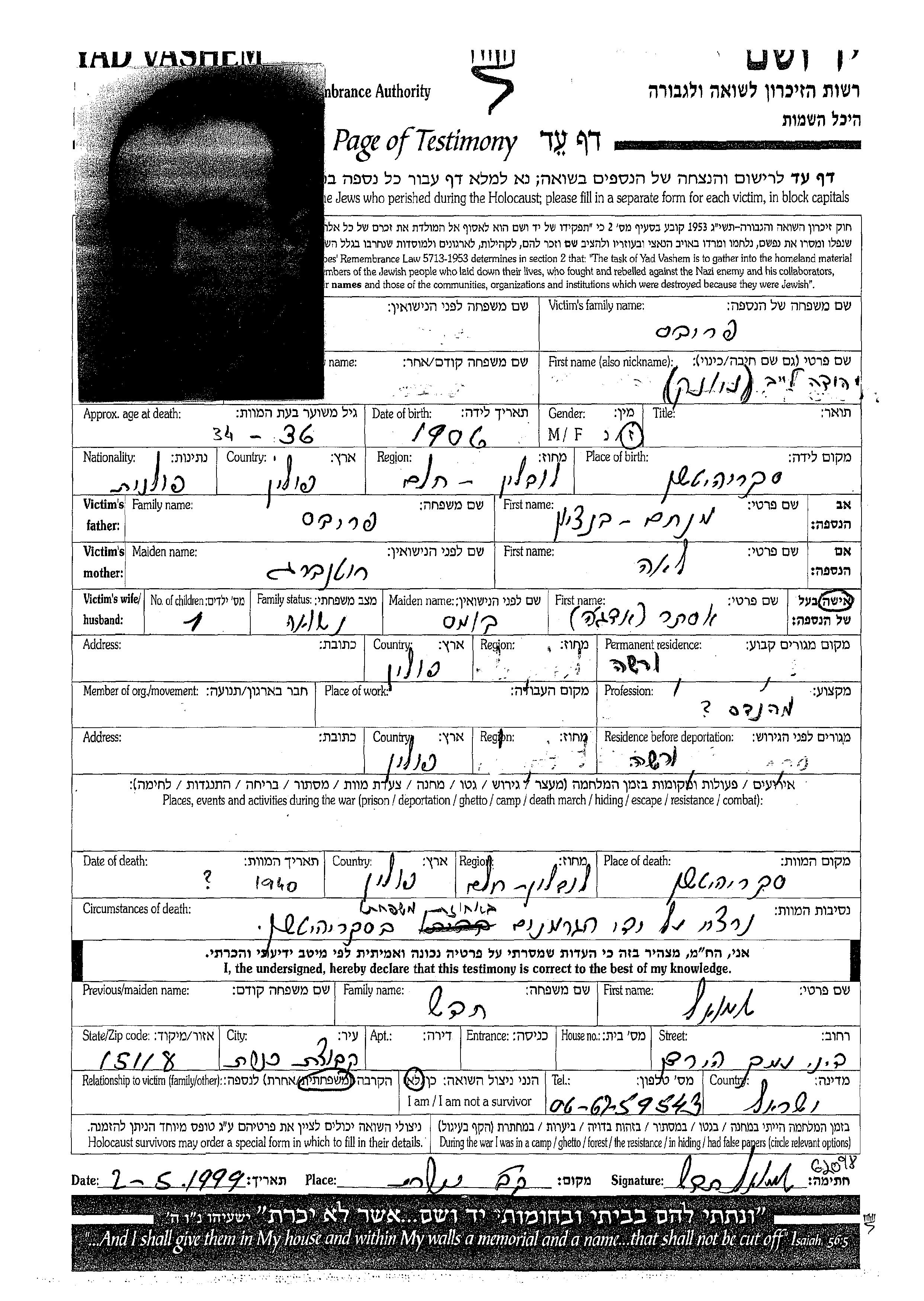 Yehuda Leib Lionek wurde in der Schoah ermordet. Todesort: unbekannter Ort im Jahr 1940.